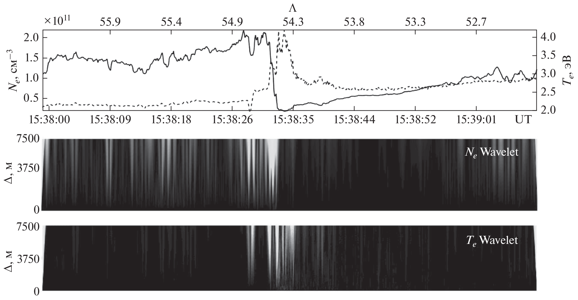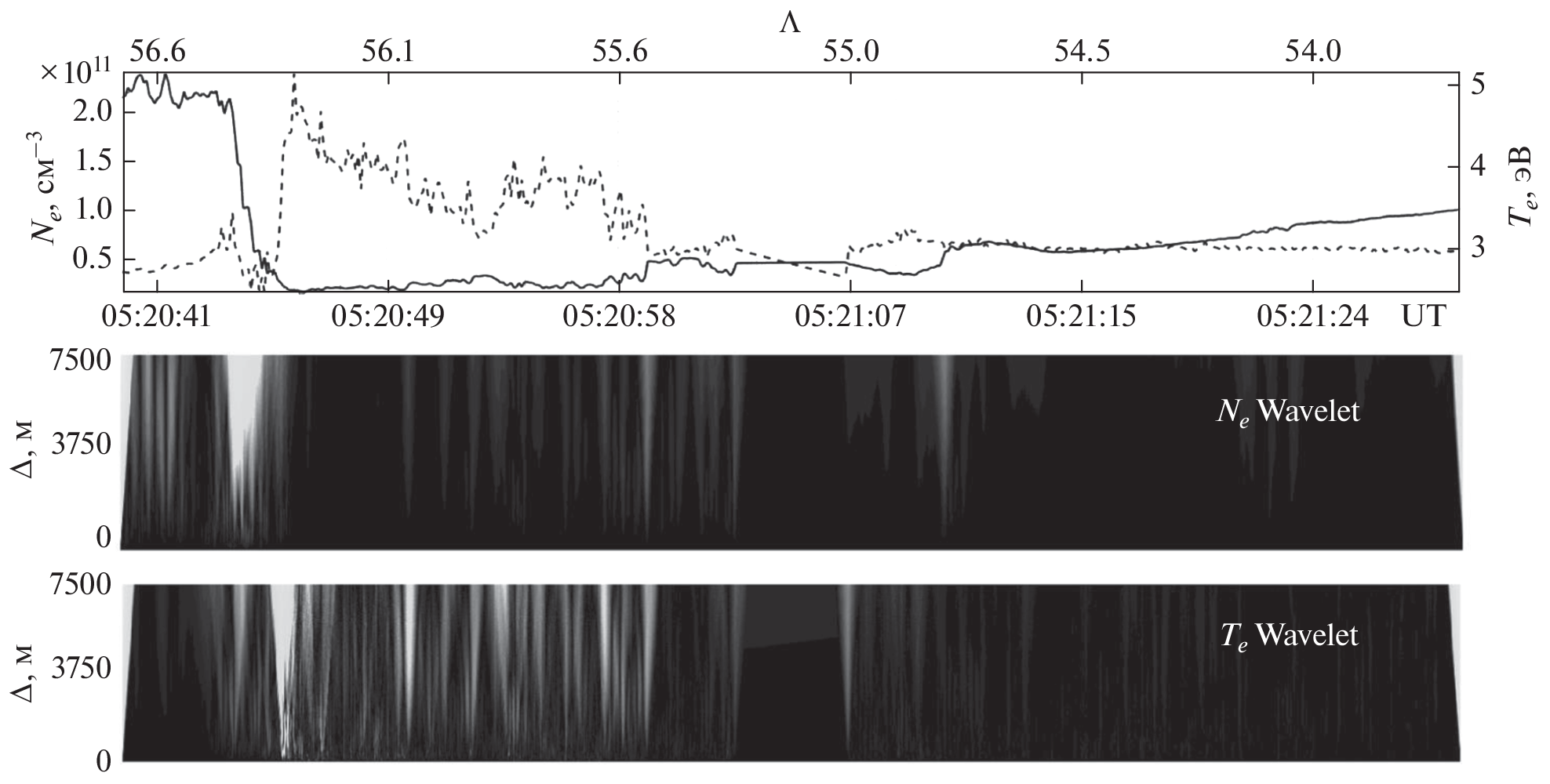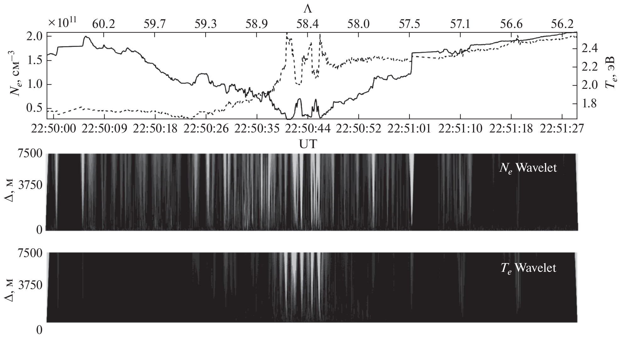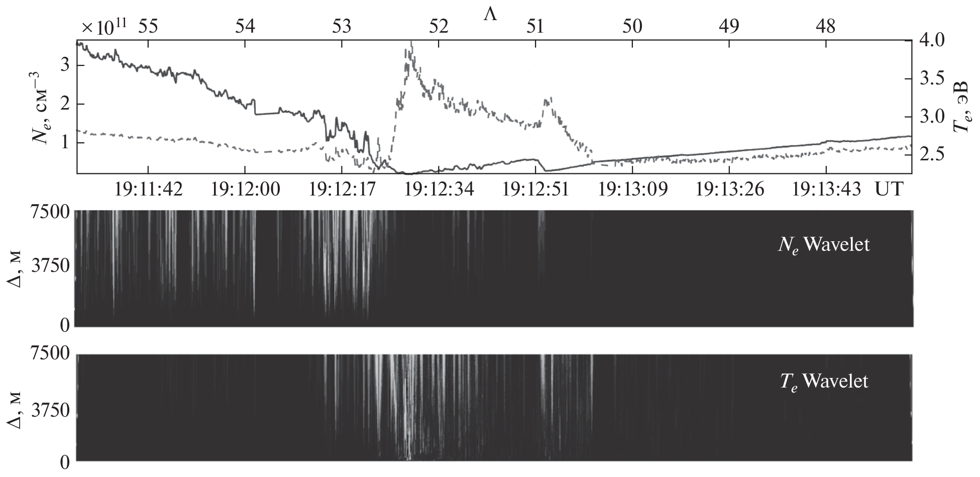 Представлены результаты исследования мелкомасштабной внутренней структуры поляризационного джета на основе спутниковых данных с использованием вейвлет-преобразования параметров ионосферной плазмы. Определены минимальные размеры мелкомасштабных неоднородностей температуры и концентрации электронов. Скорее всего, любой поляризационный джет является стратифицированным, как следует из используемой в данной работе выборки. Показано, что вейвлет-преобразование является удобным инструментом для исследования внутренней мелкомасштабной структуры поляризационного джета, причем неоднородности лучше видны по спектрограммам мощности электронной температуры, чем электронной концентрации.