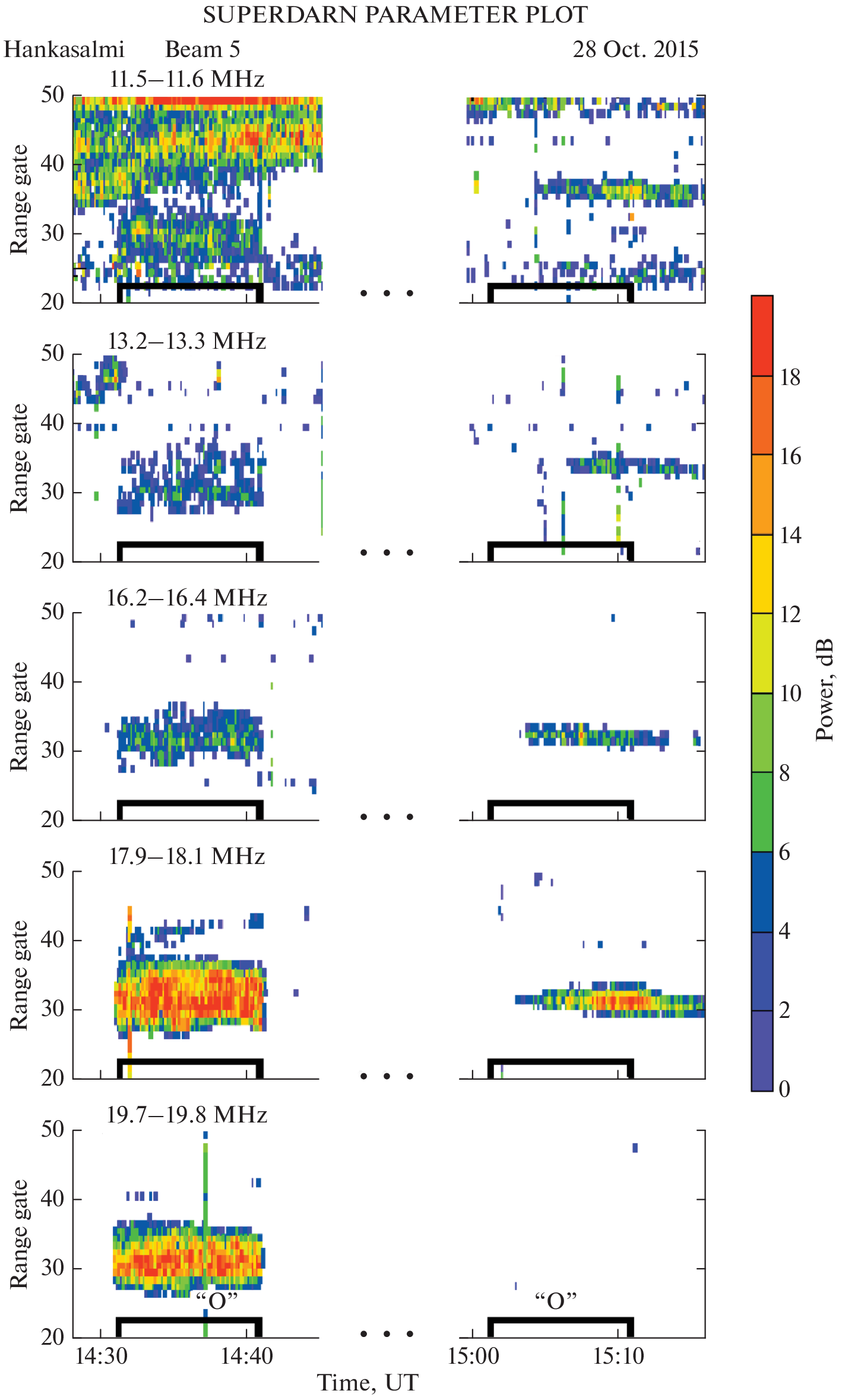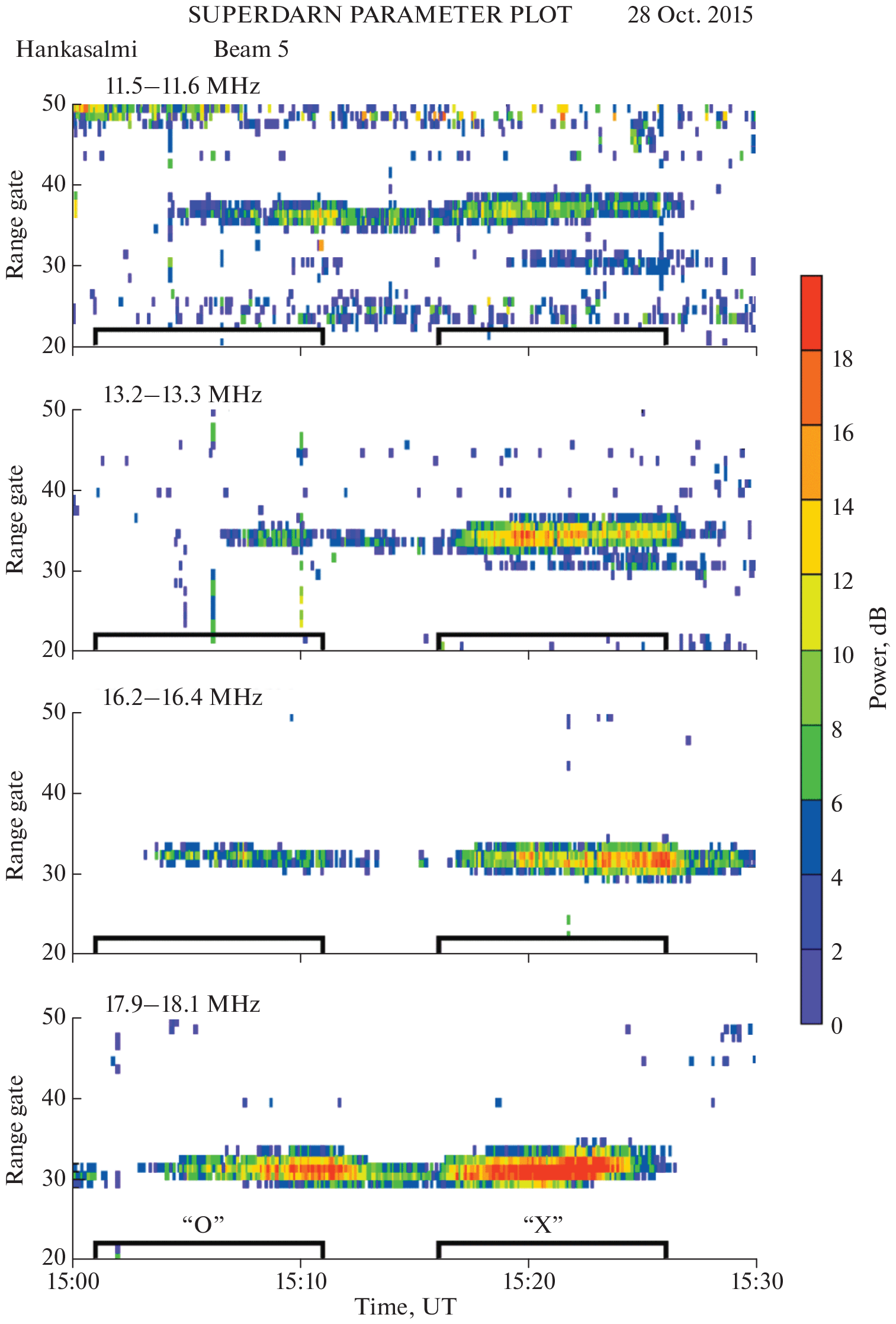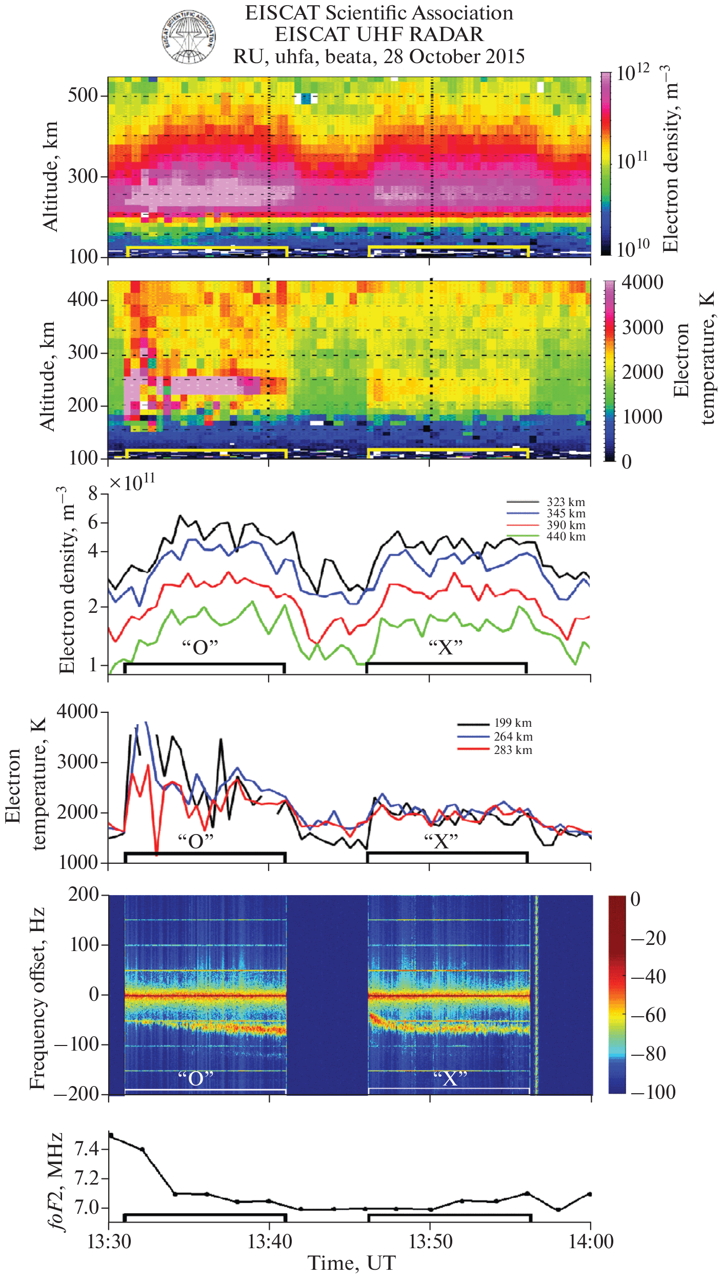 Представлены результаты экспериментальных исследований явлений в высокоширотной верхней (F-область) ионосфере, вызванных воздействием мощных радиоволн КВ-диапазона обыкновенной (О-мода) поляризации на частотах нагрева fH, существенно превышающих критическую частоту слоя F 2 (fH – fоF2 = 0.9–1.1 МГц). Результаты базируются на данных экспериментов, выполненных на КВ нагревном стенде EISCAT/Heating в г. Тромсё, северная Норвегия (69.6° N, 19.2° E). В период экспериментов мощная радиоволна КВ-диапазона О-поляризации излучалась в направлении магнитного зенита с максимальной эффективной мощностью излучения 350–550 МВт. Впервые обнаружено, что в условиях, когда мощная радиоволна КВ-диапазона О-поляризации не отражалась от ионосферы, происходит образование дактов повышенной электронной плотности Ne, генерация мелкомасштабных искусственных ионосферных неоднородностей и узкополосного (в полосе ±1 кГц относительно частоты нагрева) искусственного радиоизлучения ионосферы, регистрируемого на расстоянии ~1200 км от нагревного стенда. Выполнено сравнение характеристик мелкомасштабных искусственных ионосферных неоднородностей и спектральной структуры искусственного радиоизлучения ионосферы при альтернативном О-/Х- нагреве в магнитный зенит на частотах, существенно превышающих критическую частоту слоя F2. Установлено, что в целом их поведение имеет одинаковый характер, однако эволюция развития рассмотренных явлений при О- и Х-нагреве отличается.
