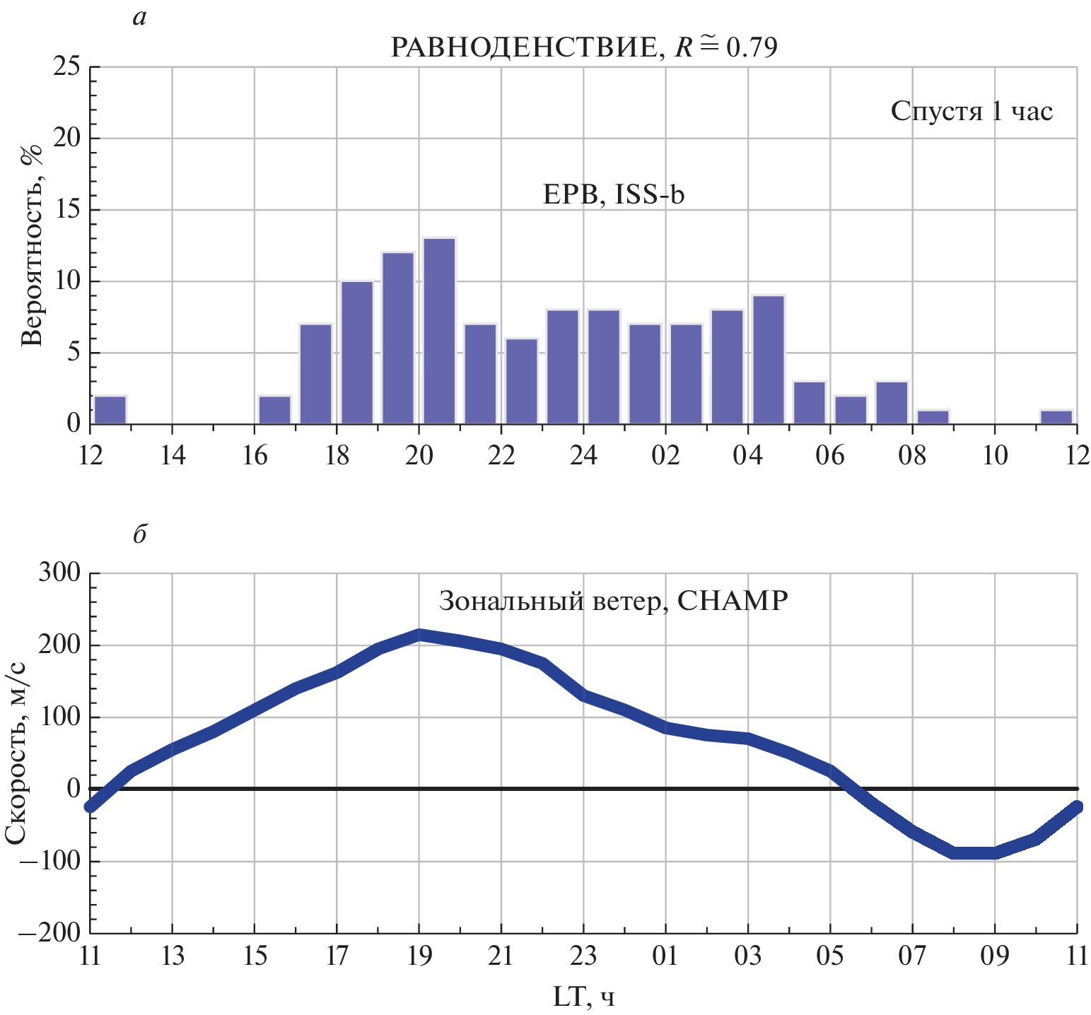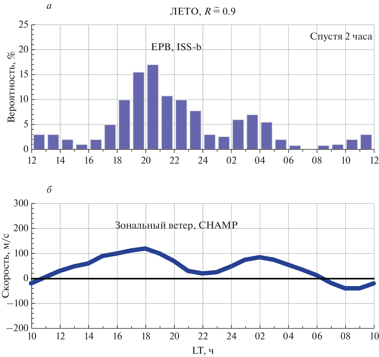There are a number of the theoretical studies pointing to the key role of the zonal thermosphere winds in the equatorial plasma bubble (EPB) generation and evolution. However, there are insufficient observational data to confirm the relationship between these phenomena. To study this relationship, the detailed comparative and correlation analysis of the LT-variations of the EPB occurrence probability and the zonal thermosphere wind velocity was carried out. The data from the EPB observations recorded aboard the ISS-b satellite (~972–1220 km) during the solstice and equinox periods were used. The data from the zonal thermosphere wind velocity observations obtained aboard the CHAMP satellite (~380–450 km) were also used. It was found that these characteristics are similar, when they are compared, and have very strong correlation (R 0.9) in summer, strong correlation (R 0.8) in winter and (R 0.79) at equinox. It was found that in all seasons the delay in the development of the EPB occurrence probability maxima with respect to the maxima of the west wind velocity is 1–3 h. It is in good agreement with the estimation of the time of the seeding perturbation development and the EPB rise to the topside ionosphere altitudes. The results can be considered a new confirmation of the theoretical conclusion (Kudeki model) about the key influence of the zonal west thermosphere winds on the equatorial plasma bubble generation.