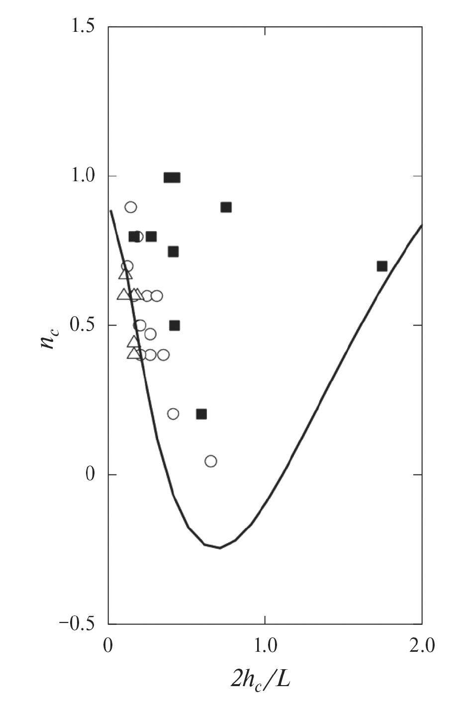 Рис. 1. Теоретическая зависимость критического значения индекса убывания магнитного поля nc от отношения критической высоты начала эрупции к расстоянию между основаниями эруптивного волокна 2hc/L (сплошная кривая) и наблюдаемые значения индекса (символы). Сплошные квадратики — по данным работы [Филиппов, 2022], пустые кружки и треугольники соответствуют несостоявшимся и успешным эрупциям, по данным работы [Filippov, 2021b].