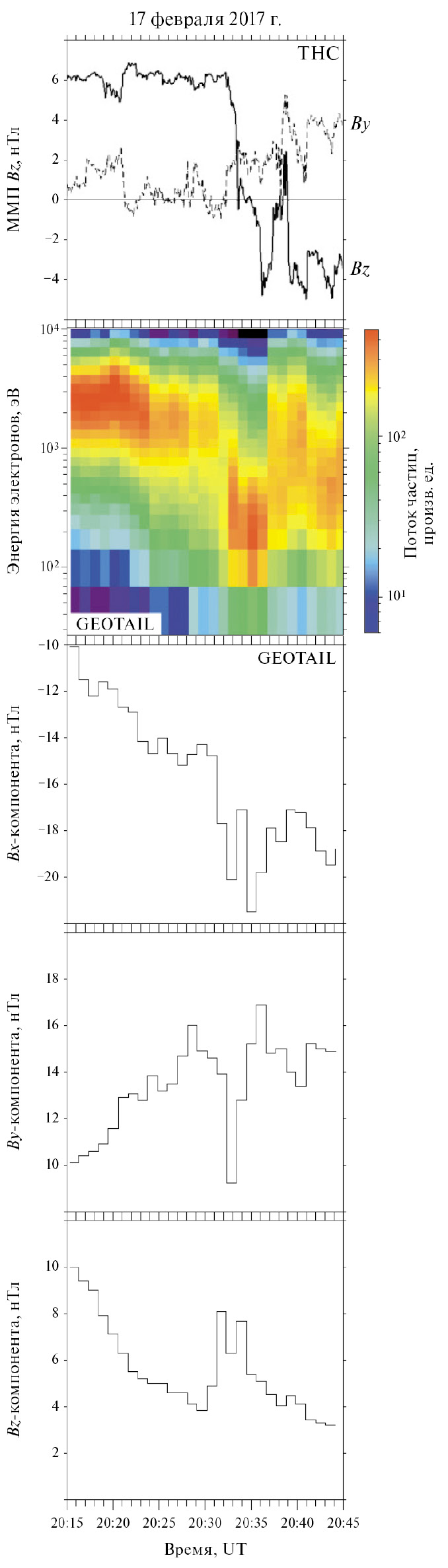 На рис. 6 для исследуемого промежутка времени представлены вариации плазмы (энергия и поток электронов) и магнитного поля на спутнике GEOTAIL. Высокая степень схожести формы возмущения плазмы на GEOTAIL с вариациями Bz на THC дает нам основания предполагать, что на GEOTAIL мы наблюдаем внутримагнитосферный отклик на изменения Bz в солнечном ветре.