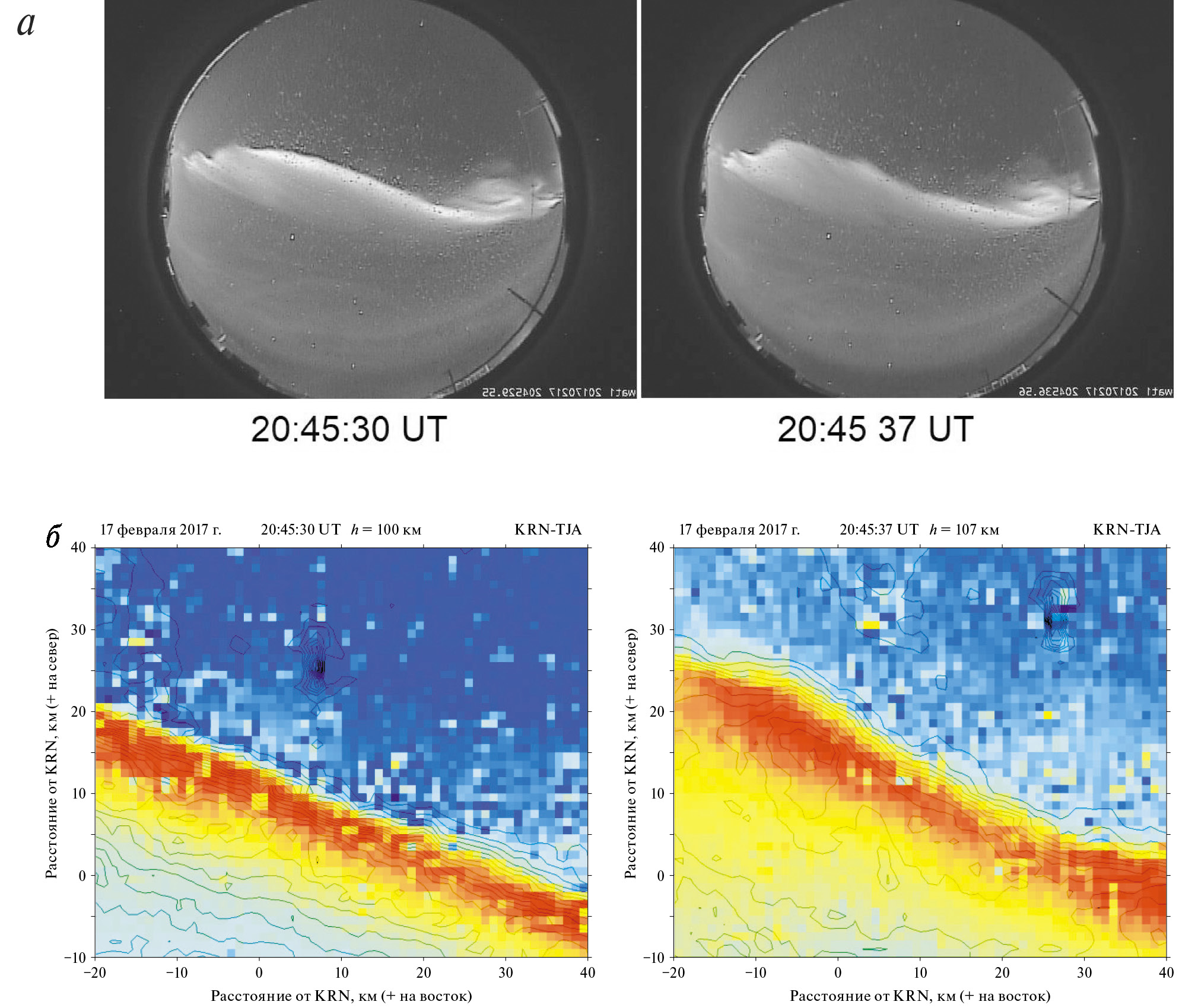 Еще одна благоприятная для триангуляционных измерений ситуация сложилась около 20:45:30 UT. На этот раз яркость дуги уменьшилась (рис. 8а), а высота дуги увеличилась (рис. 8б). Визуальное сравнение яркости ослабевшей дуги и дуги на рис. 1б показывает, что до начала вихревой активности дуга была менее яркая. Возможно, по этой причине дуга в 20:45:37 UT оказалась на меньшей высоте (107 км), чем в начале рассматриваемого интервала (110—112 км). У восточного края кадра на рис. 8а видна очередная вихревая структура. Однако после ее прохождения через зенит в ~20:46:20 UT подобных структур более не наблюдалось. Отметим также еще одну примечательность данного момента времени — смену режима пульсаций на магнитограмме (см. рис. 2). Можно предположить, что ситуация в магнитосопряженной области магнитосферы в этот момент изменилась. Причины смены мы оставляем за рамками исследования.