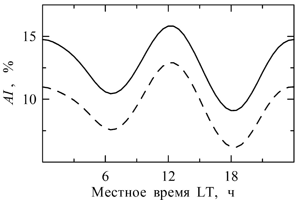 - В суточных вариациях индекса AI преобладает полусуточная мода с максимумами в дневные и ночные часы. Дневной максимум индекса AI почти не зависит от уровня солнечной активности. Ночной максимум AI уменьшается с ростом солнечной активности. Для низкой солнечной активности дневной и ночной максимумы AI почти совпадают по амплитуде, когда AI = 16—17%.