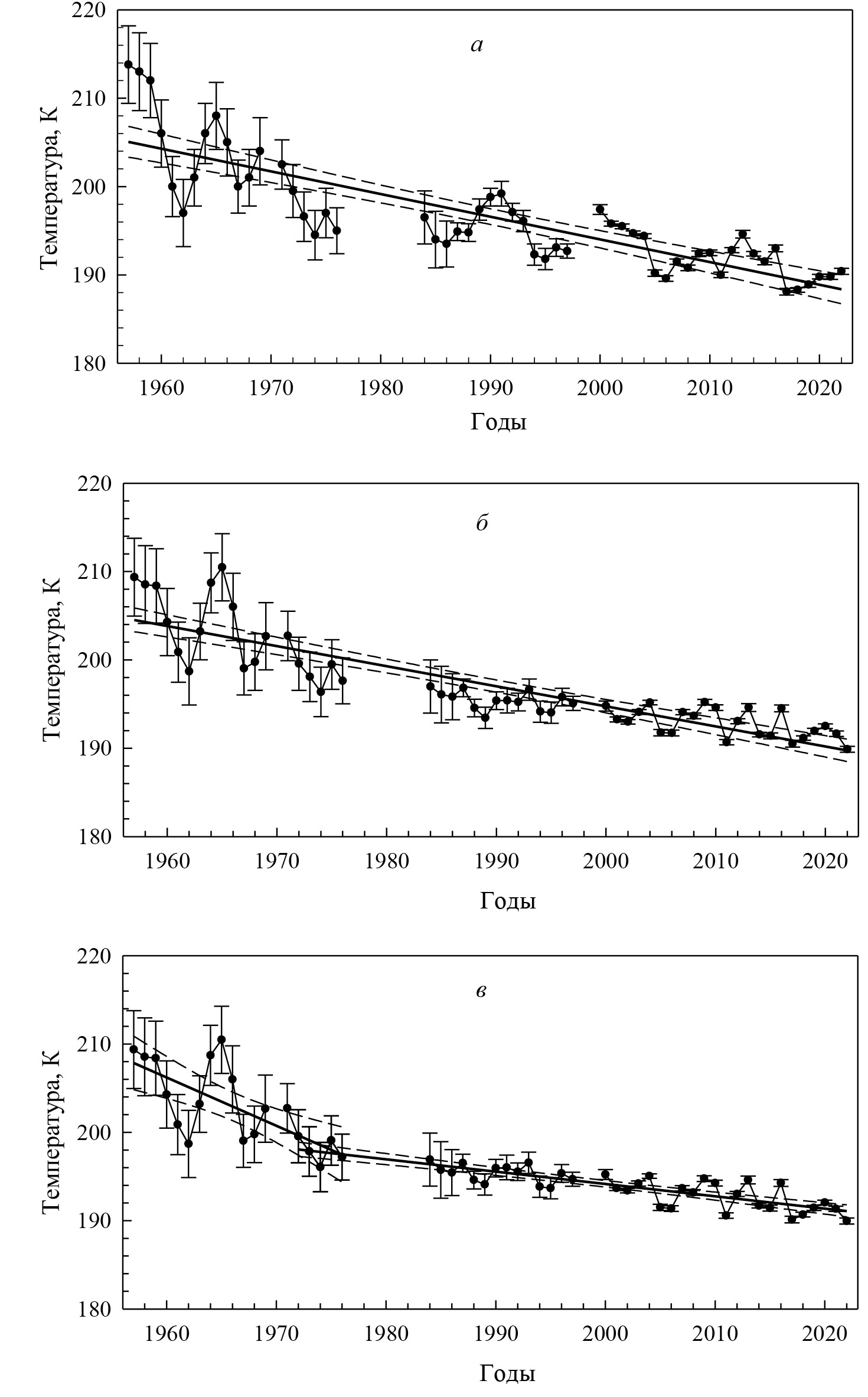 На рис. 1в показаны раздельно линейные тренды для временных периодов 1957−1976 и 1972−2022 гг. Среднегодовые значения температуры, показанные на этом рисунке (как и на рис. 1б), приведены к одному уровню солнечной активности (FLy-α = 4.5 sfu). Значения тренда и отклика температуры на изменения солнечной активности, полученные методом множественного регрессионного анализа для каждого временного интервала, представлены во второй и третьей строке табл. 1. Как видно из результатов регрессионного анализа, тренд в середине 1970-х гг. испытал значительный перелом. Его значение изменилось с −0.53 ± 0.34 до −0.14 ± 0.03 К/год. Последняя величина сопоставима со значениями тренда, полученными на основании других рядов данных и по более коротким интервалам времени в последние несколько десятков лет.