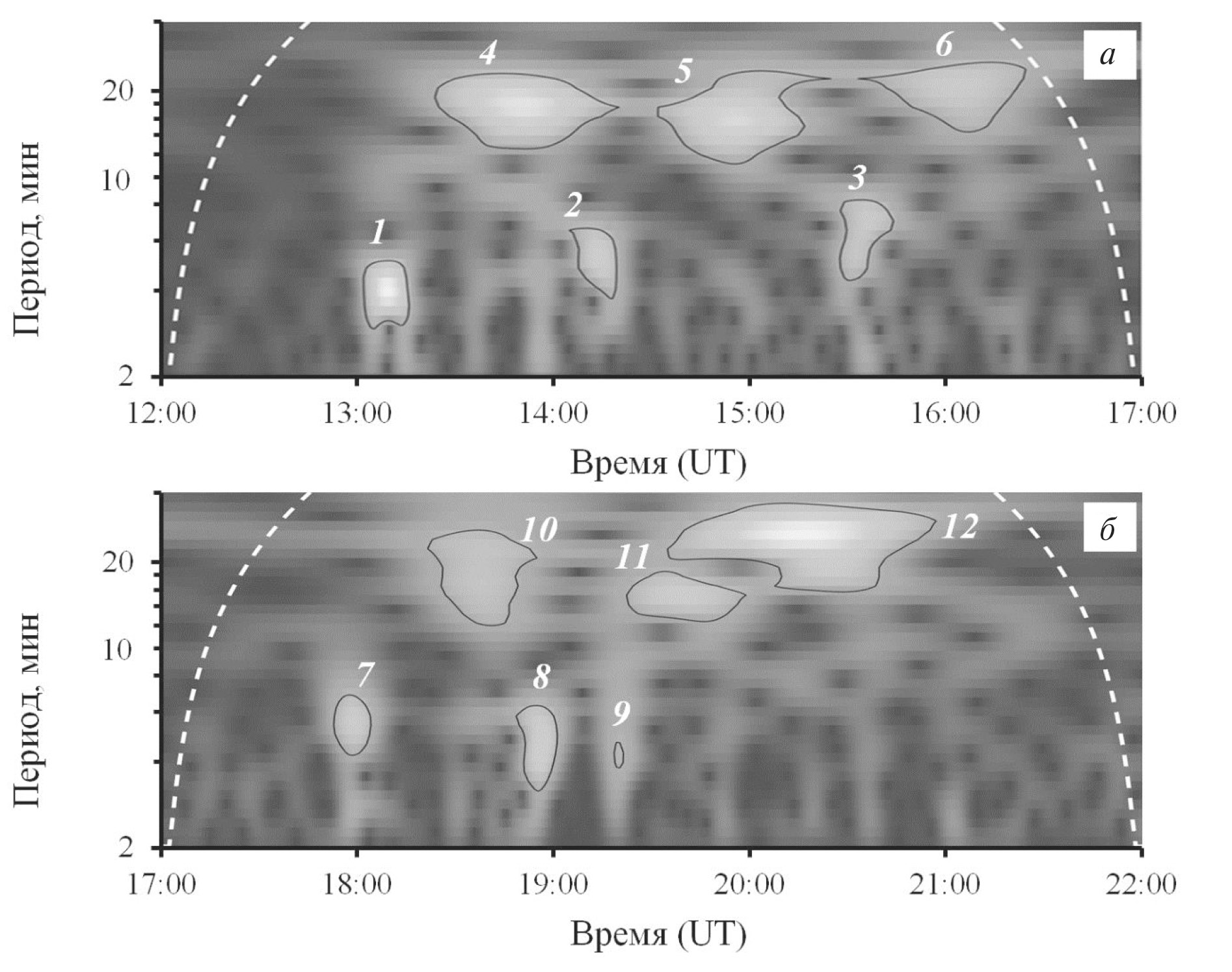 Скалограммы восточной горизонтальной By составляющей геомагнитного поля на ближайшей ст. Паратунка после извержений Шивелуч 10 апреля 2023 г. приведены на рис. 1, где в виде двух отдельных скалограмм приведен период за ~1 ч до и ~4 ч после первого начала вулканической активности Шивелуча (рис. 1а), а также приблизительно за ~1 ч до и ~4 ч после повторной (более мощной) активизации Шивелуча (рис.1б). Как видно из рис. 1, скалограммы геомагнитных вариаций характеризуются рядом спектральных гармоник. Всего на скалограммах присутствуют 12 аномалий. Первая аномалия 1 с периодом ~3−5 мин появляется спустя ~8 мин после начала активности вулкана Шивелуч, а примерно через 7−8 мин после значительных импульсов активности, произошедших приблизительно в 14:00 и 15:20 UT, наблюдаются аномалии 2 и 3 с периодами ~3.5−6.0 мин и ~4−8 мин соответственно. Спустя примерно 40 мин после начала активности вулкана Шивелуч возникают колебания (4) с периодом ~12−23 мин. В скалограмме, представленной на рис. 1, присутствуют еще две аномалии (5 и 6), возникающие примерно через 30–40 мин после значительных импульсов активности, наблюдавшихся примерно в 14:00 и 15:20 UT. Периоды этих колебаний составляют ~10−24 и ~14−25 мин. После повторной (более мощной) вулканической активности Шивелуча также в скалограмме идентифицируются шесть аномалий. Как видно из рис. 1, аномалия 7 с периодом ~4−7 мин появляется спустя ~8 мин после начала повторной активности вулкана Шивелуч, а примерно через 7−8 мин после поверхностных событий примерно в 18:46 и 19:14 UT, возможно, сопровождавших пепловые выбросы, наблюдаются аномалии 8 и 9 с периодами ~3−6 мин и ~3.5−4.5 мин соответственно. Спустя примерно 30–40 мин после начала повторной активности вулкана Шивелуч возникают колебания (10) с периодом ~12−26 мин. Кроме того, поверхностные события примерно в 18:46 и 19:14 UT также вызывают аномалии в геомагнитном поле (аномалия 11 с периодом 12‒20 мин и аномалия 12 с периодом 15‒33 мин), которые возникают примерно через 30–40 мин после соответствующего события.