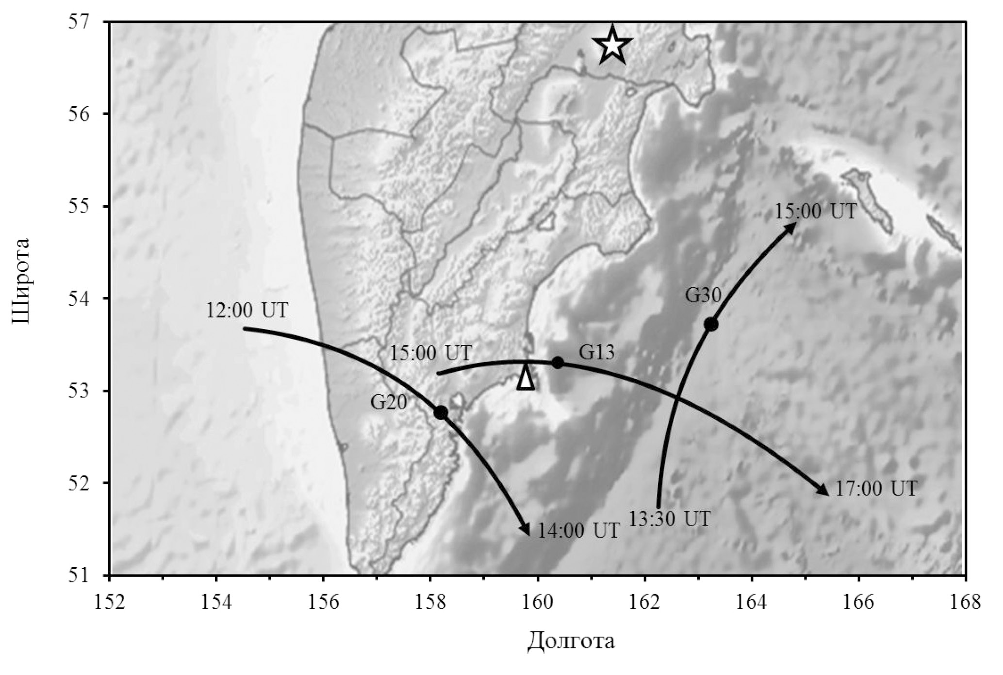 Рис. 3. Географическая карта с проекциями траекторий GPS-спутников для приемной станции pett (местоположение станции обозначено треугольником). Направление проекции трассы обозначено стрелкой с указанием времени начала и окончания (UT = LT − 12). Максимум вариаций TEC для каждой проекции траектории обозначен кружком. Местоположение вулкана Шивелуч обозначено звездой.
