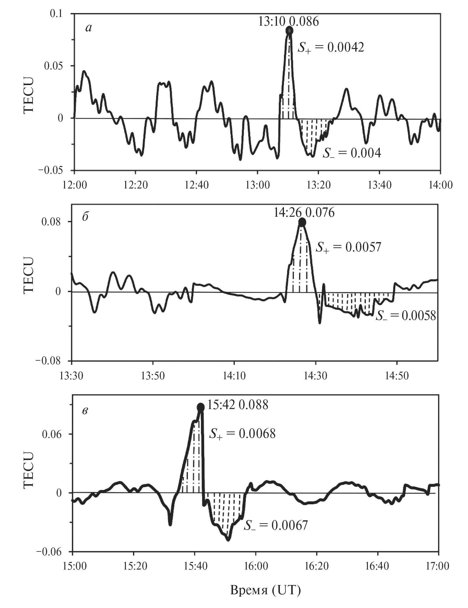 Рис. 4. Фильтрованные сигналы TEC и вычисления площадей фазы сжатия (штрихпунктир) и разрежения (штриховка): по паре “станция − спутник” pett-G20 за интервал 12:00‒14:00 UT 10 апреля 2023 г. (00:00‒02:00 LT 11 апреля 2023 г.) (а), pett-G30 за интервал 13:30−15:00 UT 10 апреля 2023 г. (01:30‒03:00 LT 11 апреля 2023 г.) (б), pett-G13 за интервал 15:00‒17:00 UT 10 апреля 2023 г. (03:00‒05:00 LT 11 апреля 2023 г.) (в); точка — максимальная величина фильтрованного сигнала на рассматриваемом интервале.