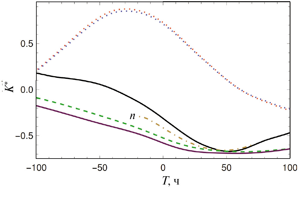 Рис. 3. Корреляционная функция давления и концентрации радона по измерениям радиометром радона Альфарад-плюс (верхняя сплошная кривая), корреляционная функция тех же величин, но полученная путем вычисления по формуле (11) с нормировочным коэффициентом 0.8 для учета шумовой помехи (штрихованная кривая). Точечная кривая с наибольшим значением в максимуме показывает корреляционную функцию положительных ионов с радоном, а вторая точечная кривая — корреляционную функцию отрицательных ионов с радоном. Штрихпунктирная кривая, помеченная символом “n”, показывает корреляционную функцию давление — нейтроны из работы [Стенькин и др., 2017]. Нижняя сплошная кривая показывает корреляционную функцию давления и радона в рамках модели II с умножением на нормировочный коэффициент 0.95.
