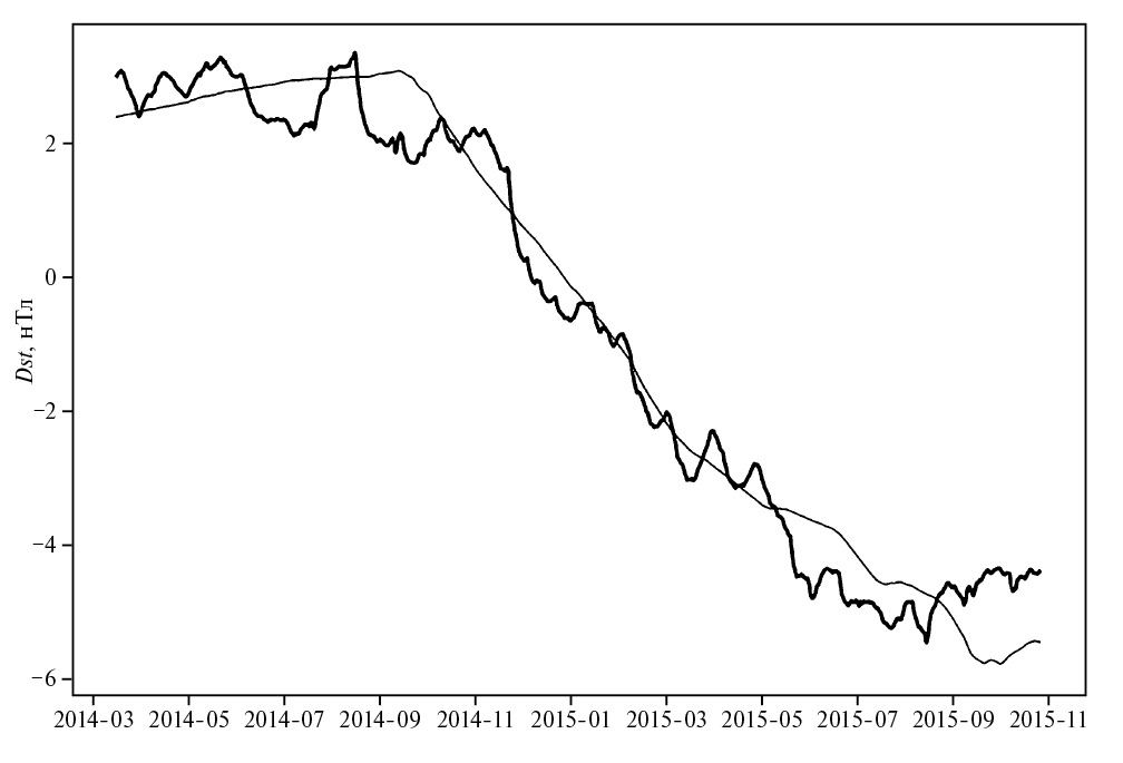 Рис. 5. Прогноз Dst методом текущей импульсной переходной характеристики с фиксированной заблаговременностью 329 сут (тонкая линия) в сопоставлении с фактической кривой (жирная линия). Среднеквадратичная погрешность прогноза — 0.40 нТл.