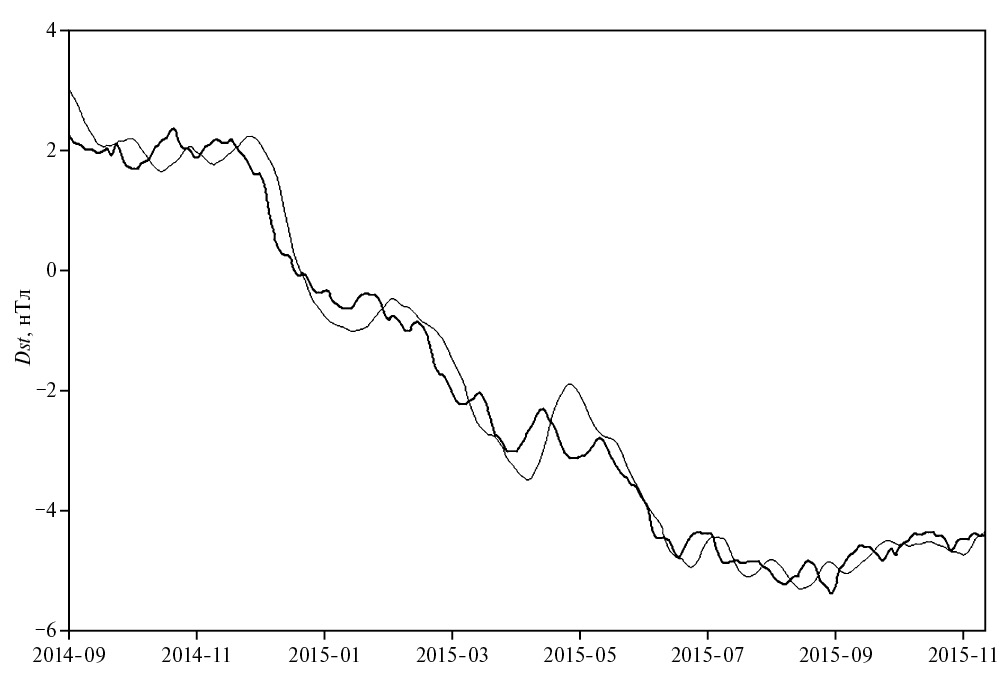 Рис. 6. Прогноз Dst методом текущей нейросети с фиксированной заблаговременностью 329 сут (тонкая линия) в сопоставлении с фактической кривой (жирная линия). Среднеквадратичная погрешность прогноза — 0.29 нТл.