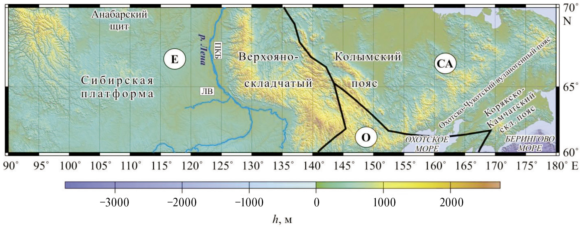 Северо-восточная часть Евразийского материка (60—70° N, 90—180° E) сложена различными тектоническими структурами (рис. 1). Ее центральную часть занимает мезозойский Верхояно-Колымский складчатый пояс, граничащий на западе по Предверхоянскому краевому прогибу с докембрийской Сибирской платформой, а на востоке отделенный от кайнозойских сооружений Корякско-Камчатского складчатого пояса Охотско-Чукотским вулканогенным поясом [Зоненшайн и др., 1990a, б; Имаева и др., 2017]. Кроме того, в пределах исследуемого региона проходят границы литосферных плит: Евразийской, Северо-Американской и Охотоморской [Bird, 2003].