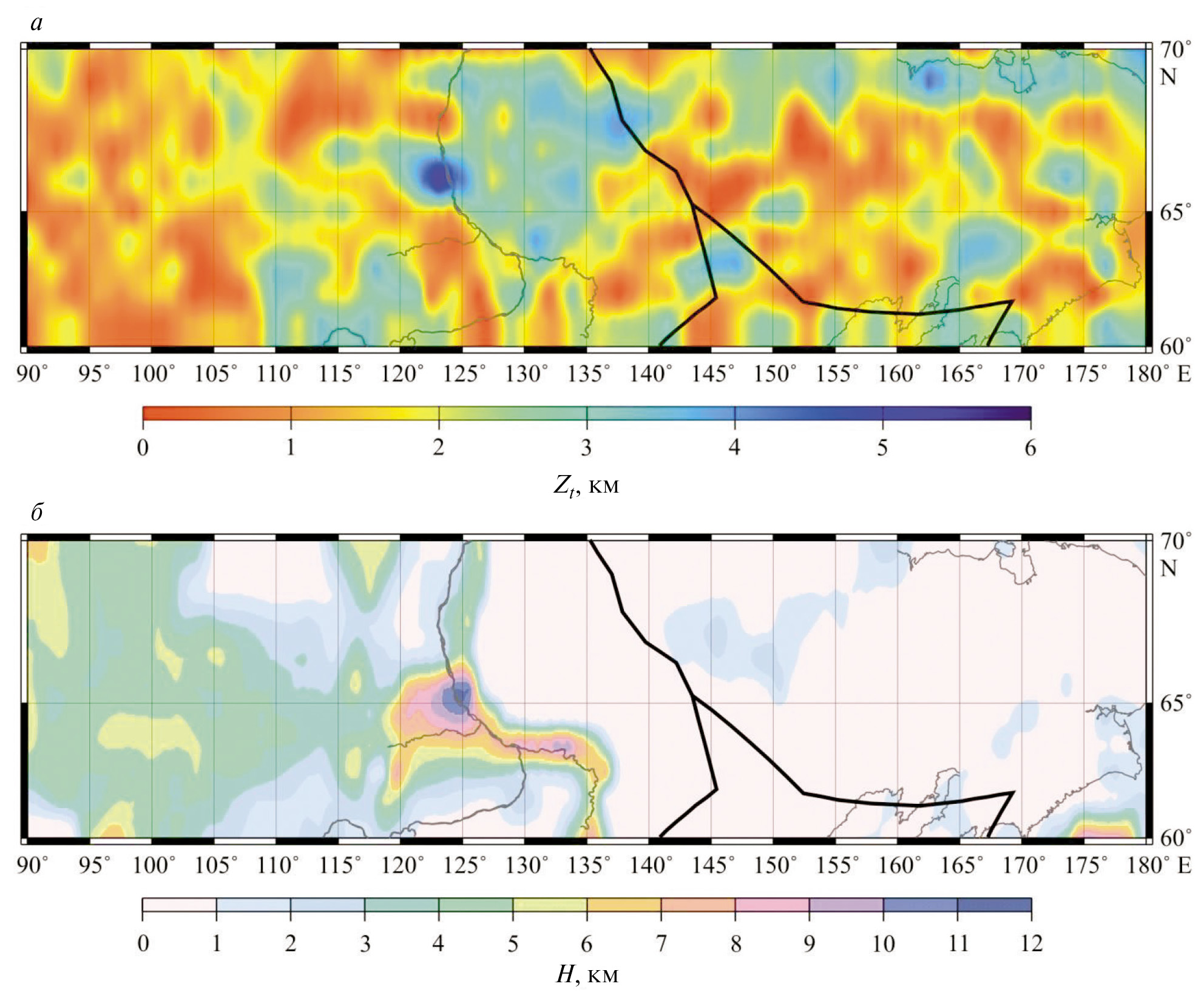 Рис. 3. Глубина верхней границы литосферных магнитных источников (Zt, км), полученная в данной работе (а), и мощность осадочного слоя (Н, км) согласно модели CRUST1.0 [Laske et al., 2013] (б). Границы литосферных плит (черные кривые) приведены согласно [Bird, 2003].