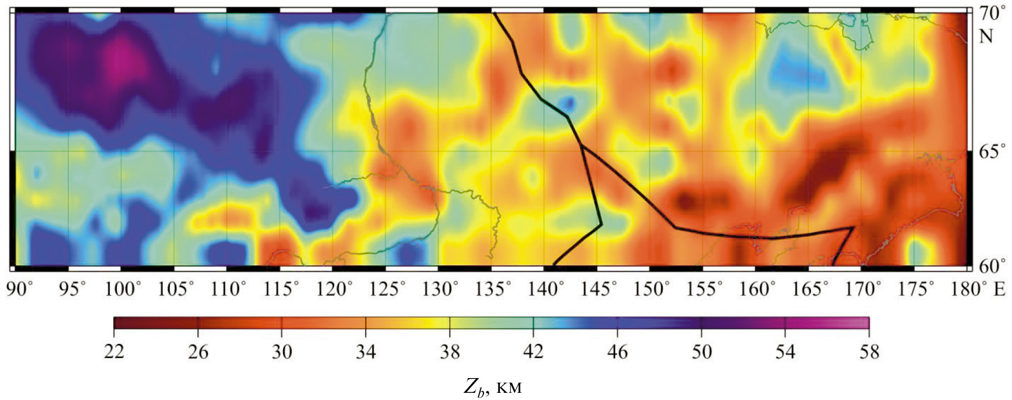 Под Верхояно-Колымским складчатым поясом прослеживается чередование максимумов (до 44 км) и минимумов (до 30 км) глубины нижней границы литосферных магнитных источников (рис. 4). Под Корякско-Камчатским складчатым поясом глубина Zb уменьшается в восточном направлении от ~34 до 26 км. Близкие значения Zb характерны также для рассматриваемых частей Охотского и Берингова морей. Минимальные глубины нижней границы для всей области исследования прослеживаются под Охотско-Чукотским вулканогенным поясом и составляют около 24 км.