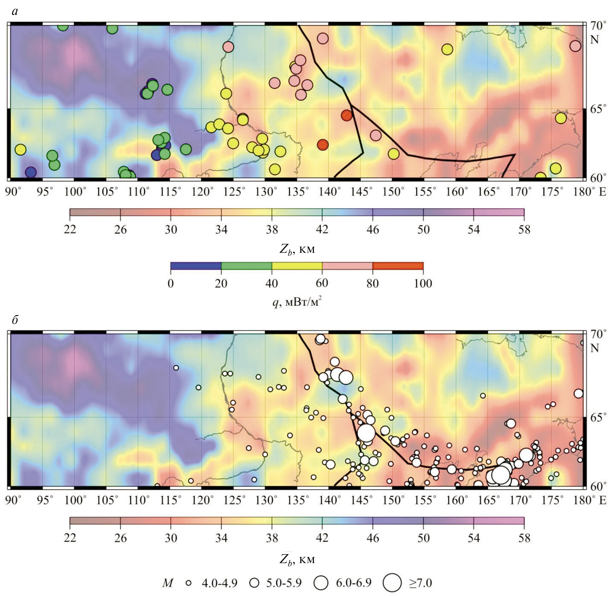 Рис. 5. Поверхностный тепловой поток (q, мВт/м2) по [Fuchs et al., 2021a] (а) и эпицентры региональных землетрясений с M ≥ 4.0, зарегистрированных в 1962—2020 гг., по [Gvishiani et al., 2022] (б) в сопоставлении с полученным распределением глубины нижней границы литосферных магнитных источников (Zb, км). Границы литосферных плит (черные кривые) приведены согласно [Bird, 2003].