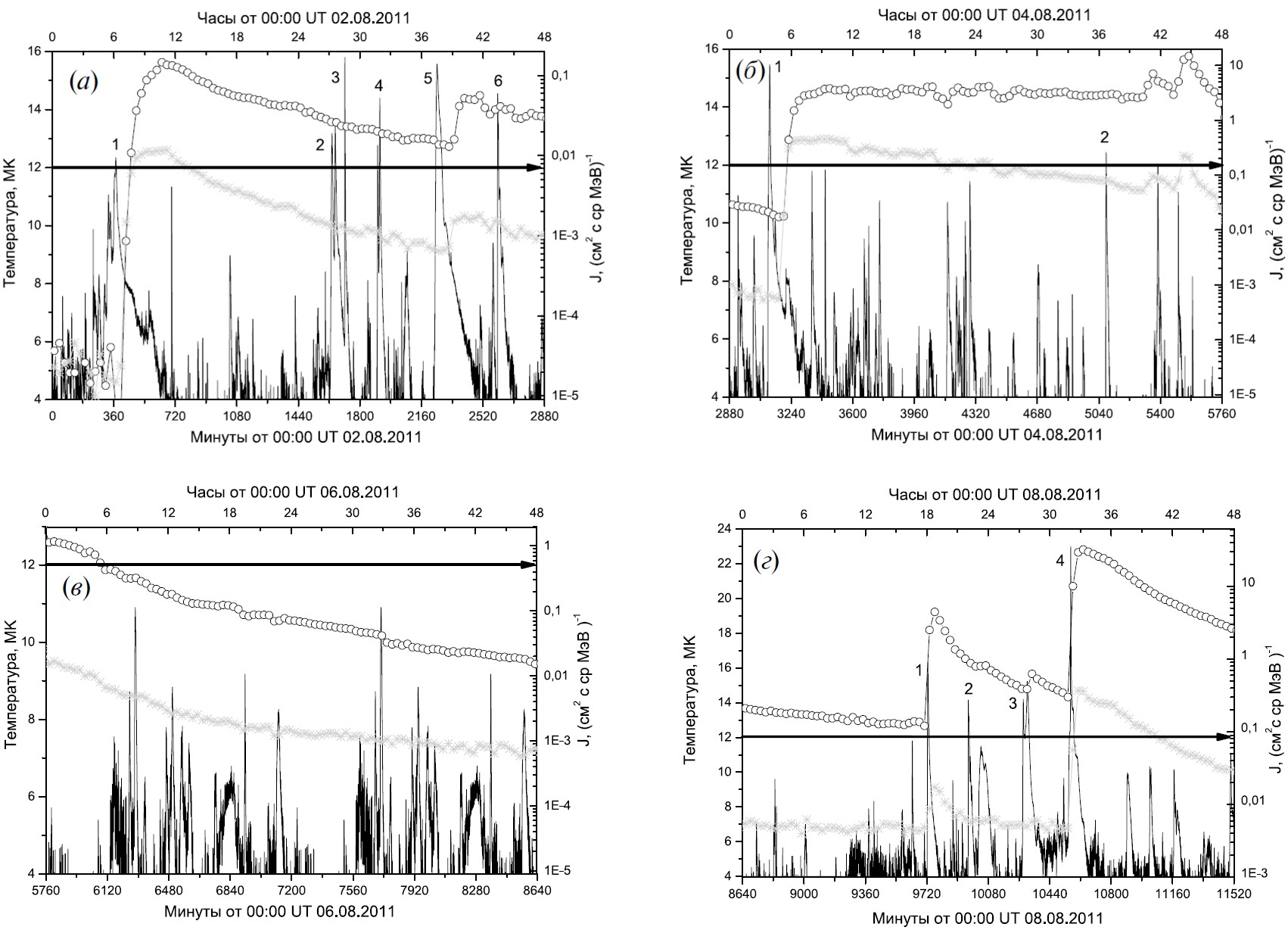 Ни одна из вспышек 6—7 августа 2011 г. (рис. 2в) не преодолела порог по температуре 12 МК. В эти дни не наблюдались КВМ со скоростями более локальной второй космической скорости (на поверхности Солнца, 618 км/с), а потоки протонов, зарегистрированные в каналах SOHO/EPHIN, монотонно спадали.