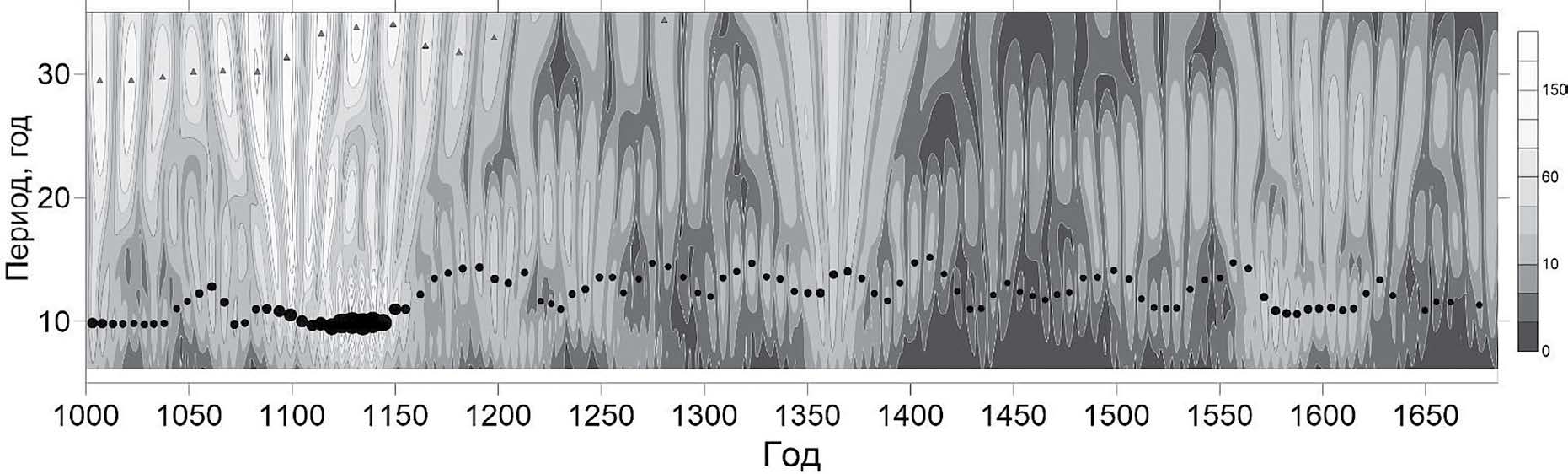 Определенные в результате анализа периоды 11-летней составляющей показаны на рис. 3 символом закрашенный круг, размер символа пропорционален амплитуде. Справа показана шкала раскраски. Из рис. 3 видно, что 11-летний сигнал наблюдается практически непрерывно на протяжении всего исследуемого периода времени. Наибольшей амплитуды 11-летняя составляющая достигает в 1100—1150 гг., т. е. во время средневекового максимума СА.