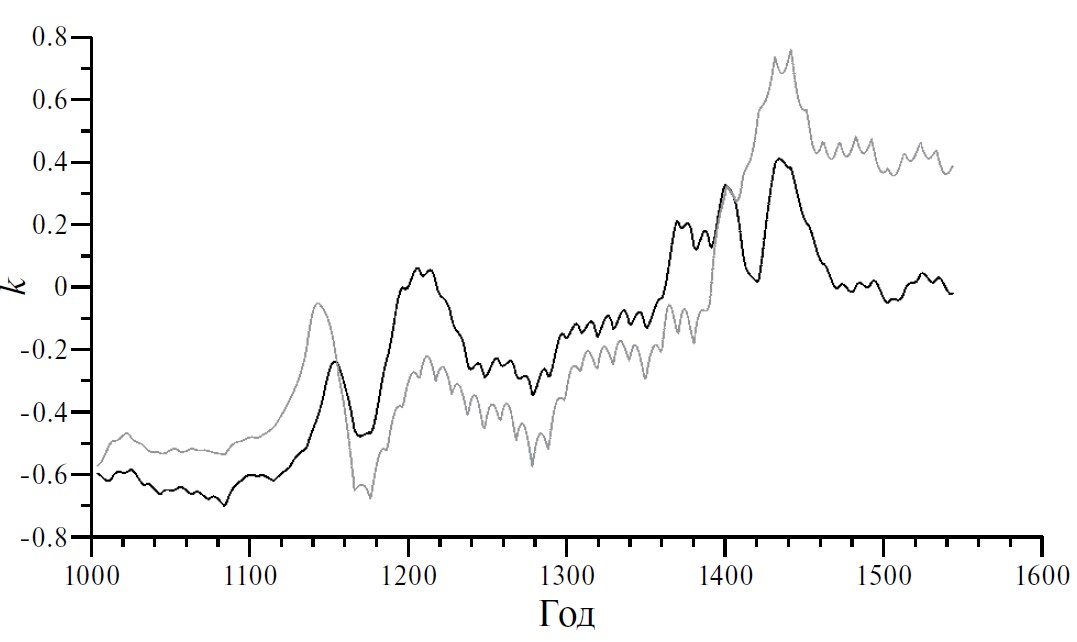 Можно заключить, что в течение исследуемых 700 лет наблюдается разная степень связи между Т и А для разных временных сдвигов между ними. Кроме того, корреляция меняет знак и величину в зависимости от времени. Смена знака корреляции для одного и того же цикла, а также при сдвиге на 1 цикл наблюдается на масштабе ~350—400 лет, а вариабельность значений k — на масштабе ~80—100 лет.