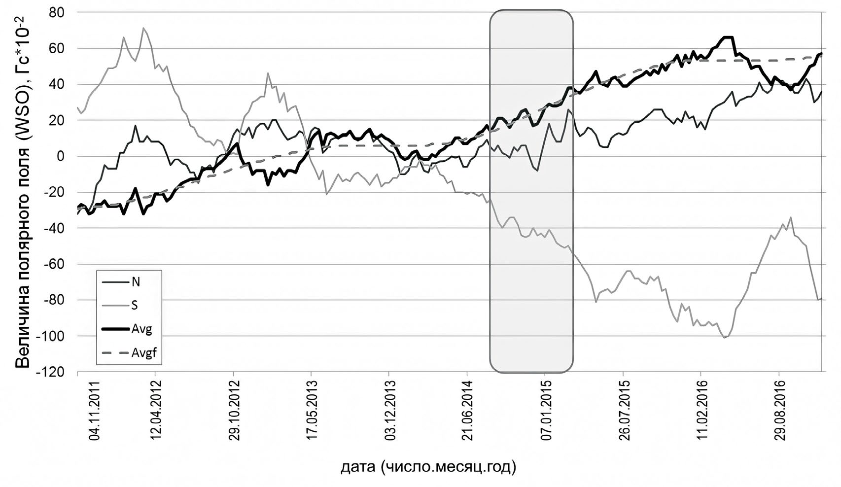 На данный момент уже опубликовано несколько работ по исследованию процесса переполюсовки полярного магнитного поля в 24-м солнечном цикле [Mordvinov and Yazev, 2014; Karna et al., 2014; Petrie et al., 2014; Пишкало и Лейко, 2016 и др.]. В частности, в работе Svalgaard and Kamide [2013] авторы указывают на то, что первой переполюсовка, как и ожидалось, произошла в Северном полушарии. Sun et al. [2015] получили, что среднее магнитное поле на широтах > 60° изменило свою полярность в Северном и Южном полушариях соответственно в ноябре 2012 и в марте 2014 г. В работе Karna et al. [2014] получено, что процесс переполюсовки в Северном полушарии закончился еще раньше, к середине 2012 г. На рис. 3 приведены данные обс. WSO (http://wso.stanford.edu/Polar.html), также подтверждающие окончание процесса переполюсовки до начала исследуемого периода, выделенного затемненной областью. Однако детальный анализ данных по солнечному магнитному полю в этот период свидетельствует о более сложной ситуации. Хорошо заметно, что скорости роста величины магнитного поля в Северном и Южном полушариях различаются, и модуль южного полярного поля значительно превышает величины, регистрируемые на севере.