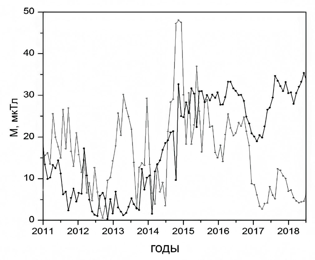 Рис. 4. Величина магнитного диполя на Солнце в 2011—2018 гг. Серая кривая — экваториальный диполь, черная — осевой диполь.