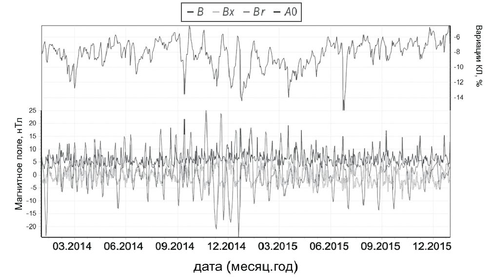 Если обратиться к данным по величинам магнитных диполей на Солнце (см. рис. 4), то период конца 2014 — начала 2015 г. очень сильно выделяется, поскольку величина экваториального диполя имеет аномально высокие значения.