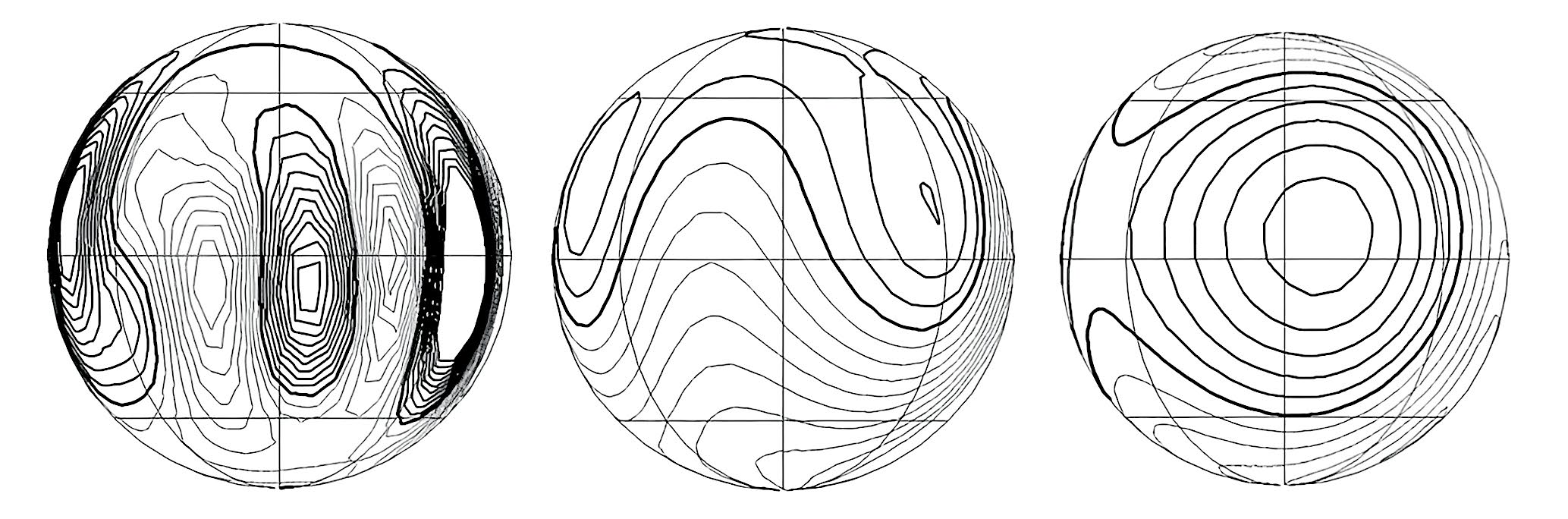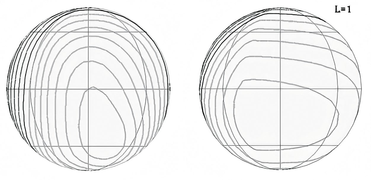 Рис. 9. Магнитное поле на сфере на поверхности источника (слева) и поле диполя (справа, гармоника с L =1).
