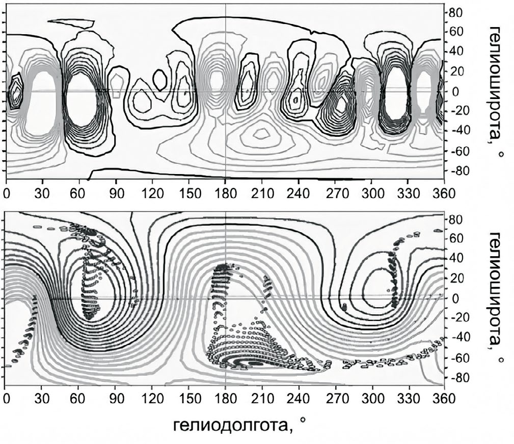 На рис. 8 показана синоптическая карта магнитного поля на поверхности фотосферы (сверху) и на поверхности источника (снизу), центрированная на 9 ноября 2014 г. (этому дню присваивается значение 180° гелиографической долготы). Кружками на нижней панели показаны основания открытых силовых линий, которые и обрисовывают видимую на правой панели рис. 7 южную полярную КД.