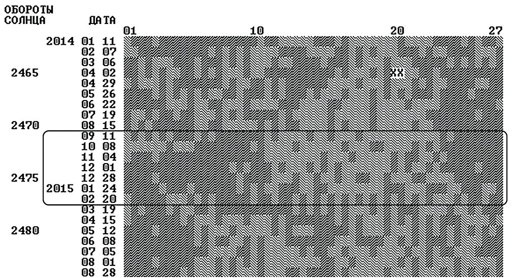 Рис. 10. Распределение полярности ММП по 27-дневным периодам (по Бартельсу) за 2014—2015 гг. На верхней шкале — дни оборота Бартельса. Прямоугольником выделен обсуждаемый период.