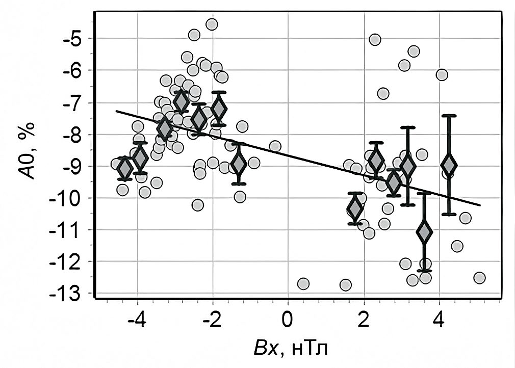 Рис. 12. Связь величины модуляции потока КЛ (A0,%) от знака экваториальной составляющей ММП (Bx, нТл) для периода сентябрь 2014 г. — февраль 2015 г.