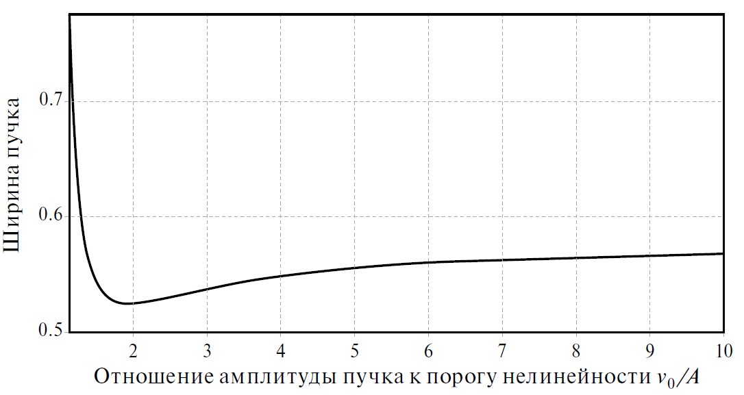 Рис. 1. Зависимость ширины пучка от отношения его амплитуды к величине порога нелинейности.