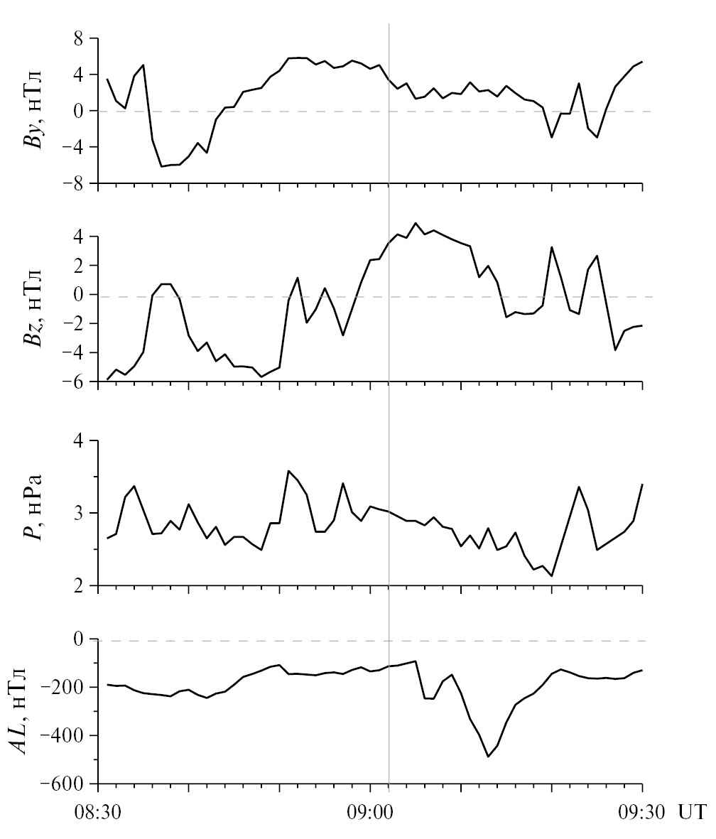 На рис. 2 показаны вариации параметров межпланетной среды и уровня магнитной активности в авроральной зоне в коротком интервале времени 08:30 – 09:30 UT, включающем в себя пролет спутника F16. Время пересечения спутником области авроральных высыпаний в дневном секторе отмечено сплошной вертикальной линией. Сверху вниз на рис. 2 показаны By- и Bz- компоненты ММП, динамическое давление солнечного ветра (Р, нПа) и вариации AL-индекса магнитной активности. Данные по межпланетной среде, приведённые из точки либрации L1 к магнитосфере Земли, взяты на портале OMNI Web (http://cdaweb.gsfc.nasa.gov/). Как видно из рисунка, By- и Bz-компоненты ММП во время пролета спутника были положительными величиной ~3 нТл, скорость, плотность и динамическое давление солнечного ветра менялись незначительно: V ~ 820 км/с, N ~ 4 см-3, P ~ 3.0 нПа. Уровень магнитной активности в полуночном секторе авроральной зоны был низким, AL > –200 нТл.