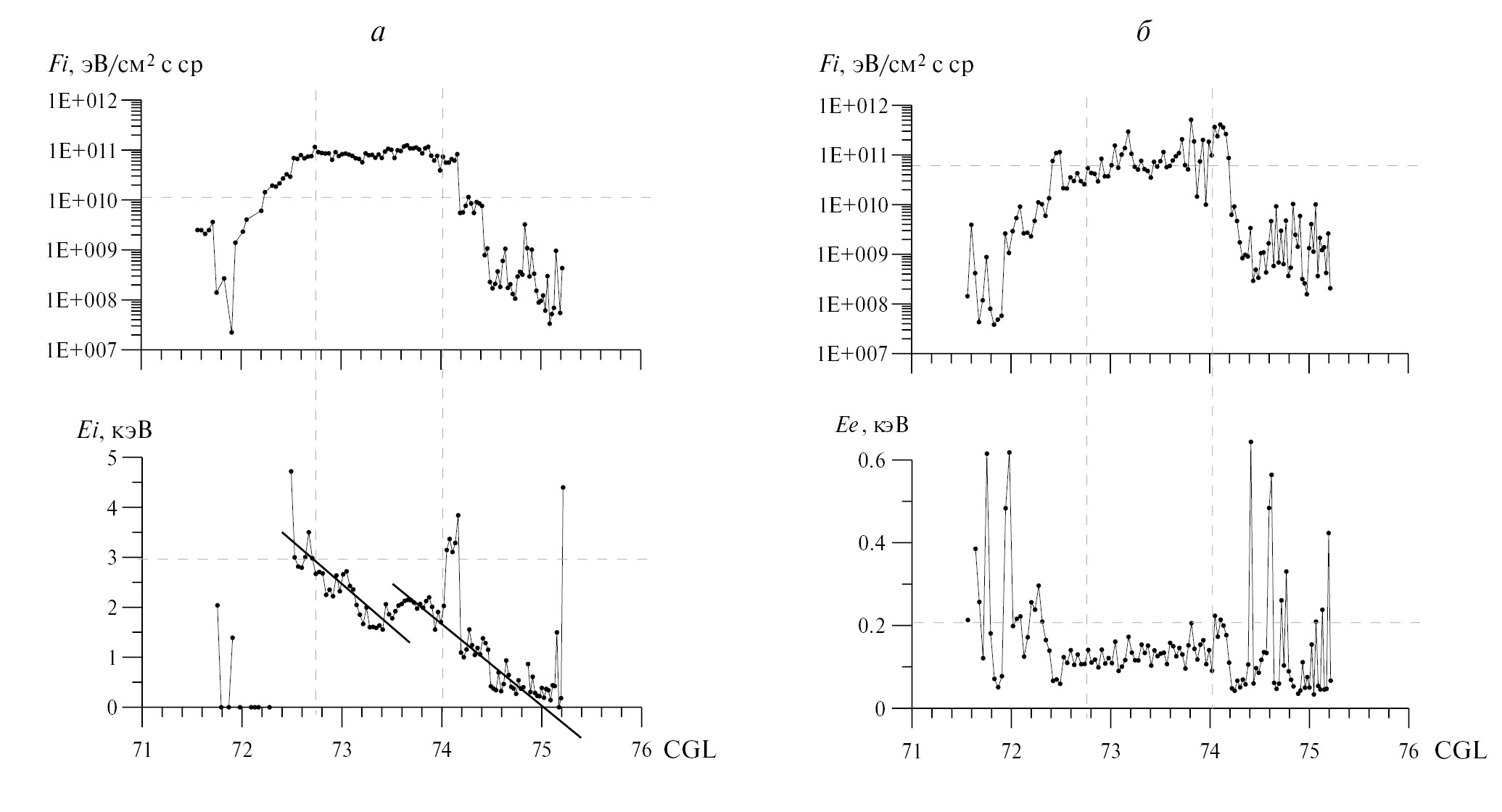 Как видно на рис. 4а (нижняя панель), поведение средней энергии высыпающихся ионов (Ei) с увеличением широты имеет довольно сложный характер. В каспе Ei сначала уменьшается от экваториальной границы каспа к центральной его части, достигая минимальных значений на широте ~73.4° CGL, а затем быстро увеличивается на широтах 73.4°‒73.6° CGL. В приполюсной части каспа и в области мантии также наблюдается отчетливо выраженное уменьшение Ei с увеличением широты. Тенденции изменения средней энергии высыпающихся ионов с увеличением широты показаны на рис. 4а (нижняя панель) отрезками тонких сплошных линий.