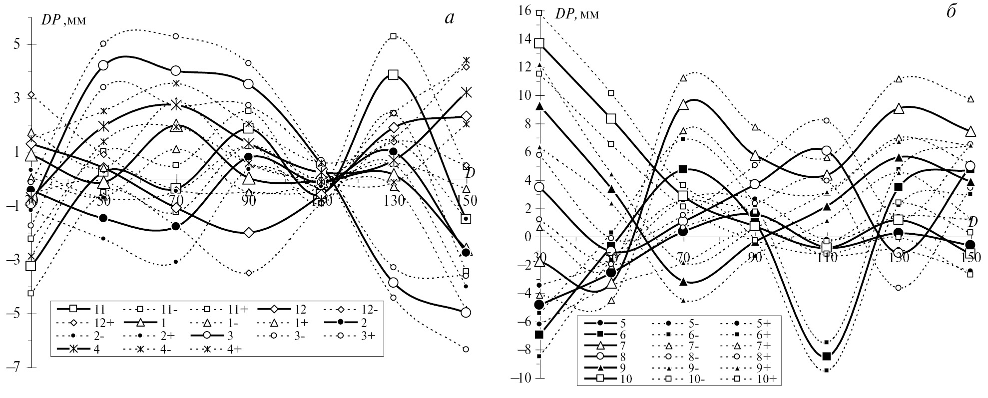 Жирными линиями обозначены [DP]mj для разных месяцев года, а пунктирными линиями обозначены диапазоны их погрешностей ±σ. Номер жирных линий на этих рисунках соответствует номеру месяца года. Пунктирные линии ‘1–‘ и ‘1+’ есть границы диапазона погрешности для средних DP января, ‘2–‘ и ‘2+’ − для февраля, и т. д.