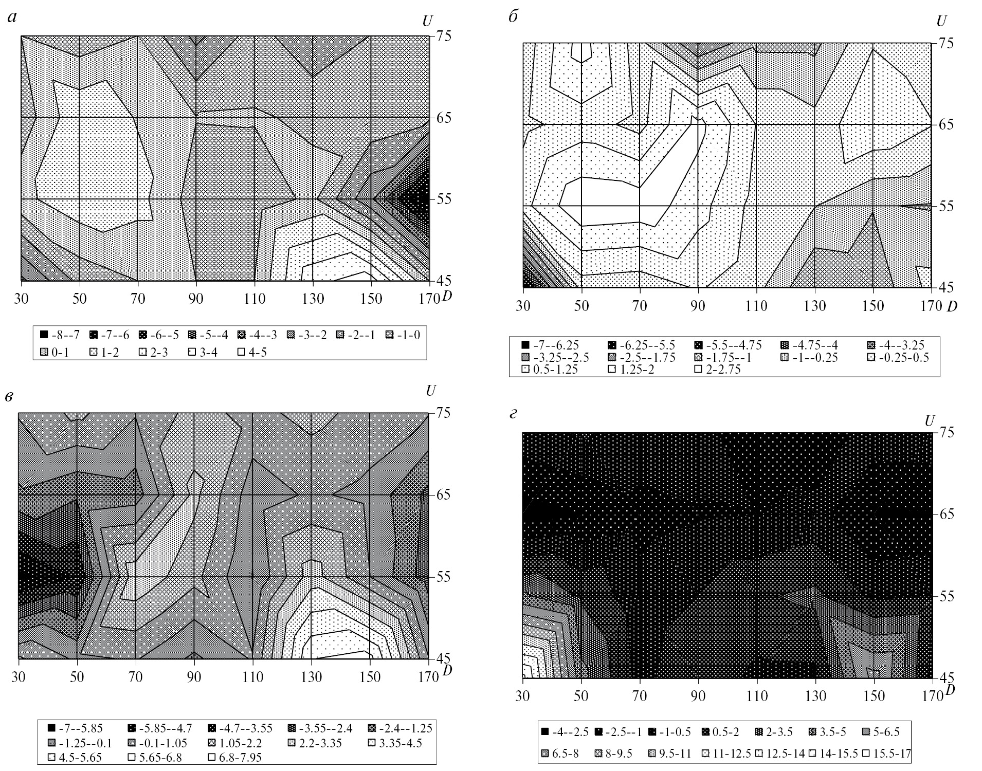 Рис. 3. Зависимость среднего по ноябрю, декабрю и январю (а); февралю, марту и апрелю (б); маю, июню и июлю (в); августу, сентябрю и октябрю (г) параметра DP от широты U и долготы D для четырех интервалов широт в диапазоне U = 40–80° N и восьми интервалов долгот в диапазоне D = 20–180° E.