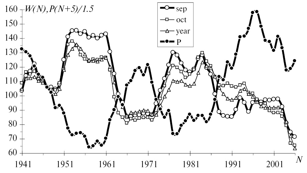 Мы видим, что корреляция со знаком минус достигает максимальных величин при сдвиге чисел Вольфа на месяц назад. Стоит заметить, что сдвиг на 5 лет вперед у кривой P обнаруживает максимальную величину корреляции со знаком минус не только для кривой sep, но и для кривых oct и year. На рис. 5 введены обозначения: N − номер года; W − числа Вольфа; P − увеличенное вдвое количество осадков.