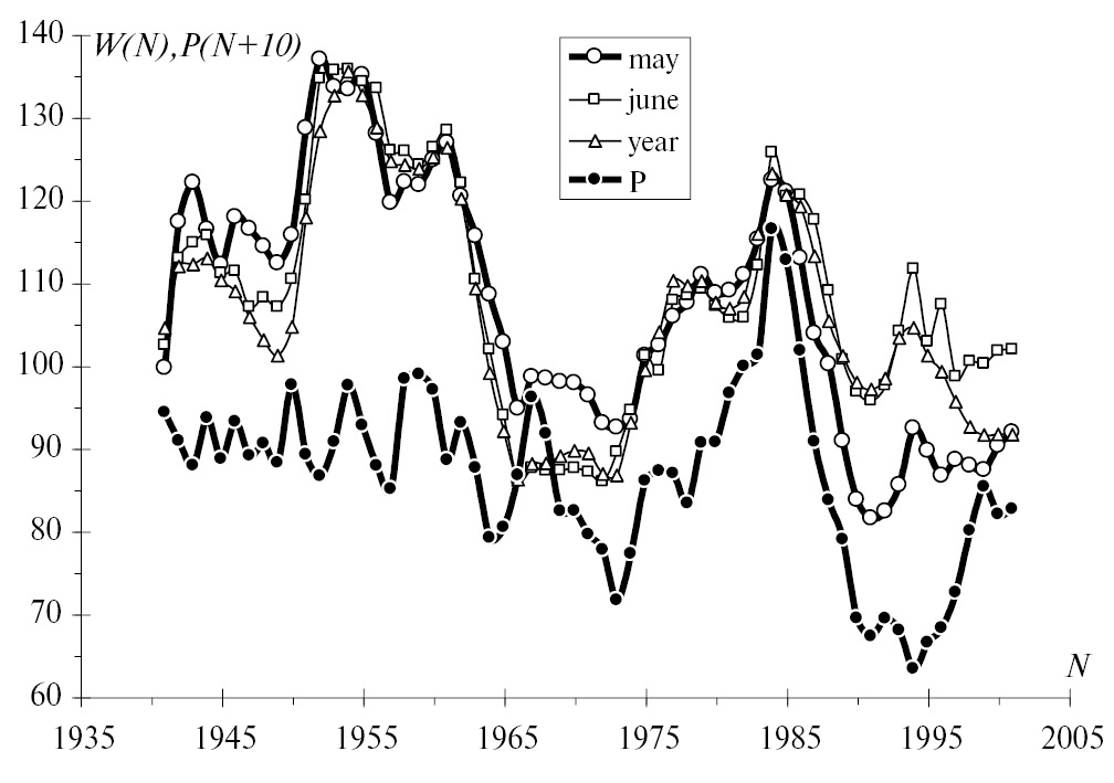 Следующий рисунок (рис. 7) выполнен аналогично рис. 5 для ст. Благовещенск (U = 50.2° N, D = 127.6° E, H = 132 м). Станция Благовещенск попадает в полосу долгот D = 110−130° E и широт U = 40−55° N и находится в зоне особенно больших величин параметра DP, где сама величина DP = −8.5 ± 1.0 мм для июня месяца. На рис. 7 изображены 4 кривые. Кривая may− числа Вольфа для месяца май, усредненные по 11 годам методом скользящего среднего, кривая june − числа Вольфа для месяца июнь, усредненные по 11 годам тем же методом. Кривая year − годовые числа Вольфа, усредненные по 11 годам тем же методом. Кривая P − есть сумма осадков в июне месяце для ст. Благовещенска, усредненная методом скользящего среднего по 11 годам и со сдвигом на 10 лет вперед. Величина сдвига 10 лет для кривой P близка к полному солнечному циклу и позволяет обнаружить влияние максимумов солнечной активности на сумму осадков. Коэффициент корреляции кривой may и кривой P составил 0.70. Коэффициент корреляции кривой june и кривой P составил 0.48. Коэффициент корреляции кривой year и кривой P составил 0.54.