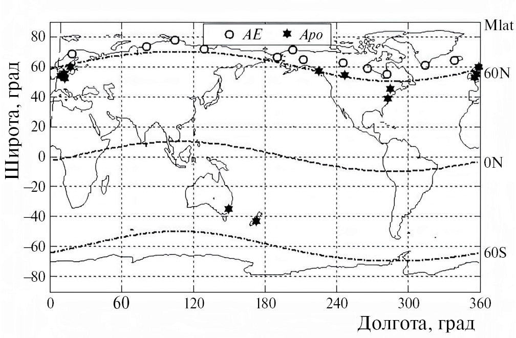 Прежде чем перейти к сравнению поведения геомагнитных AE и Apo индексов во время интенсивных геомагнитных бурь, рассмотрим расположение сетей магнитометров, на основе измерений которых вычисляются эти индексы (рис. 1). Видно близкое расположение источников данных в высоких широтах. Сеть магнитометров для AE-индекса располагается выше 60° магнитной широты в Северном полушарии, а сеть для Apo-индекса, совпадающая с сетью 3-часовых ap- и Kp-индексов, − вблизи 60° магнитной широты в Северном полушарии и двух станций в Южном полушарии.