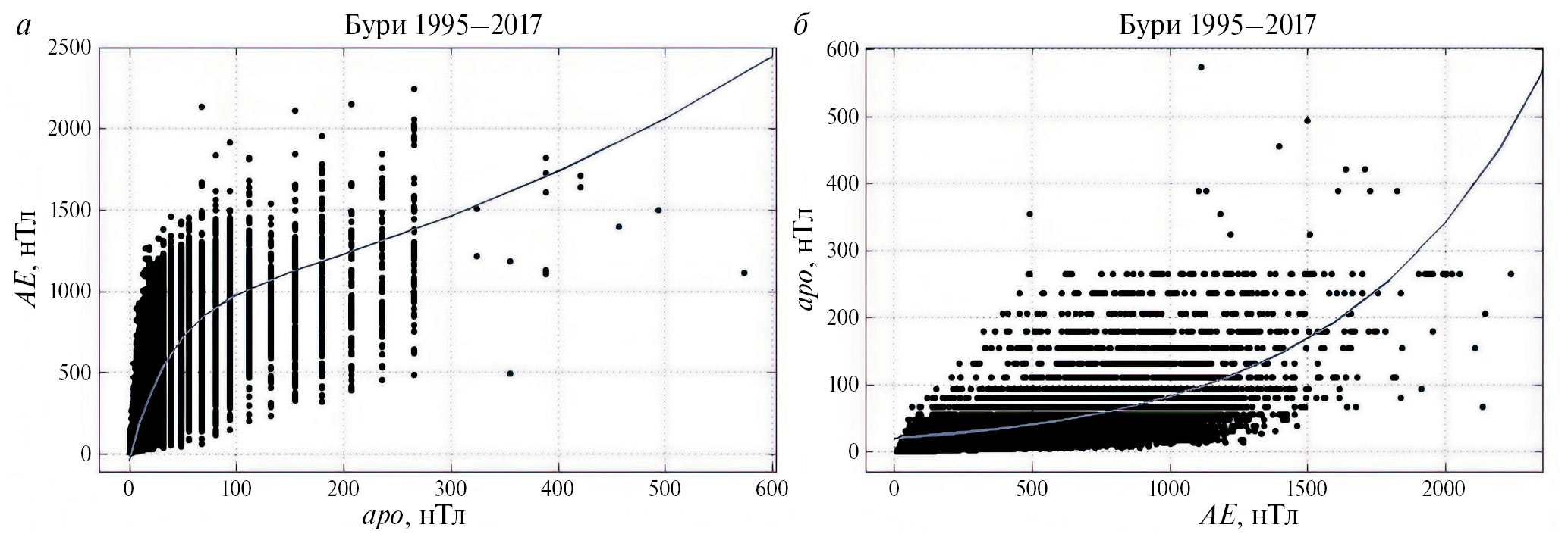 На рис. 3а приведена зависимость индекса AE от Apo, и на рис. 3б – обратная ей зависимость Apo от AE, построенная по данным профилей бурь, приведенных на рис. 2а, б. Точками показаны исходные данные, сплошная кривая – экспоненциальная модель, построенная по методу наименьших квадратов: