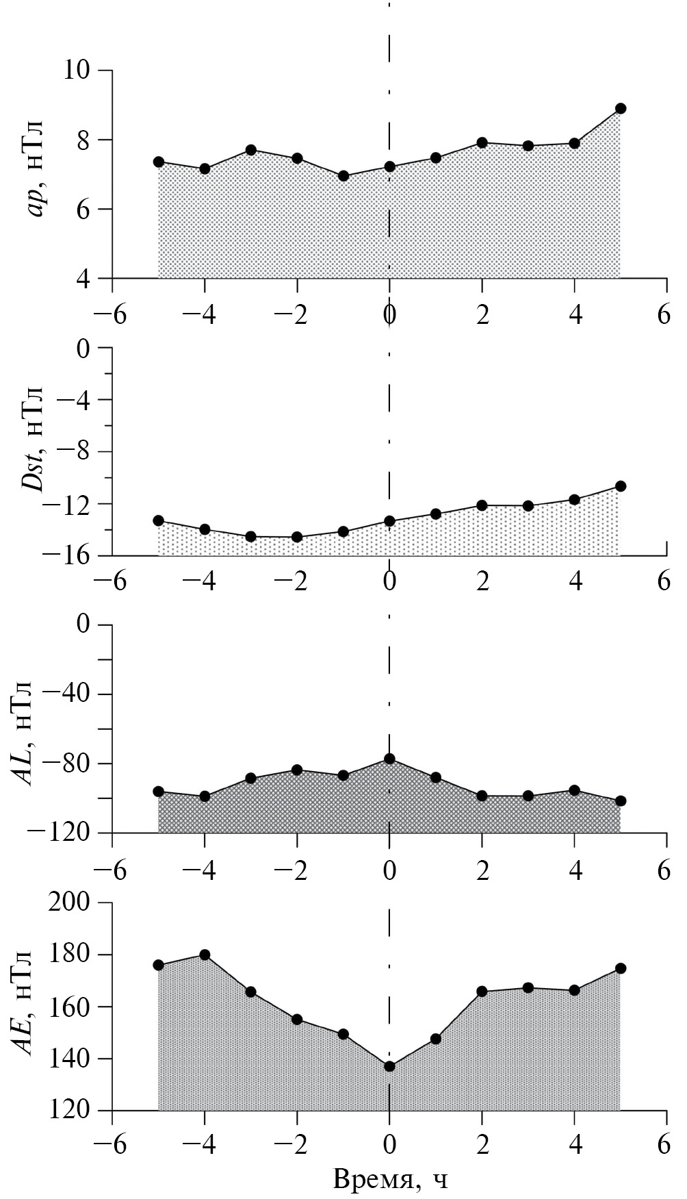 Динамика геомагнитных индексов, полученная методом наложения эпох, показана на рис. 4. Здесь и далее за реперную точку, как и при построении рис. 2, принимался час, в котором несущая частота, постепенно спадая, достигала наименьшего значения fmin в каждом анализируемом случае. Все индексы анализировались на интервале времени 5 ч до и 5 ч после момента, соответствующего fmin. Судя по величине и динамике ap-, Dst- и AE-индексов, планетарная возмущенность и геомагнитная активность в средних, экваториальных и авроральных широтах была очень слабой во время наблюдения понижений несущей частоты SE. В это время отсутствовали магнитные бури. Согласно Loewe and Prӧlss [1997] величина минимального значения Dst-индекса для развития слабой геомагнитной бури должна заключаться в пределах −30 нТл ≥ Dst > −50 нТл. В нашем случае величина модуля Dstmin не превышала 15 нТл (рис. 4). Кроме того, на ночной стороне магнитосферы не развивались суббури. В динамике AL-индекса отсутствовали отрицательные бухты и величина AL-индекса была > −100 нТл как до нулевой точки, так и после. В целом авроральная активность (как видно из динамики AE-индекса) плавно убывала к моменту fmin и затем постепенно возрастала. Следует заметить, что поведение AE-индекса имело внешнее сходство с усредненной вариацией несущей частоты серпентинной эмиссии (рис. 2). Таким образом, эффект понижения несущей частоты SE наблюдается при относительно низкой геомагнитной активности, которой должны соответствовать относительно стабильные параметры солнечного ветра и ММП. Тем не менее, как показали наши исследования [Куражковская и др., 2016], даже при слабой геомагнитной активности некоторые параметры солнечного ветра оказываются значимыми факторами, влияющими на УНЧ-колебания.