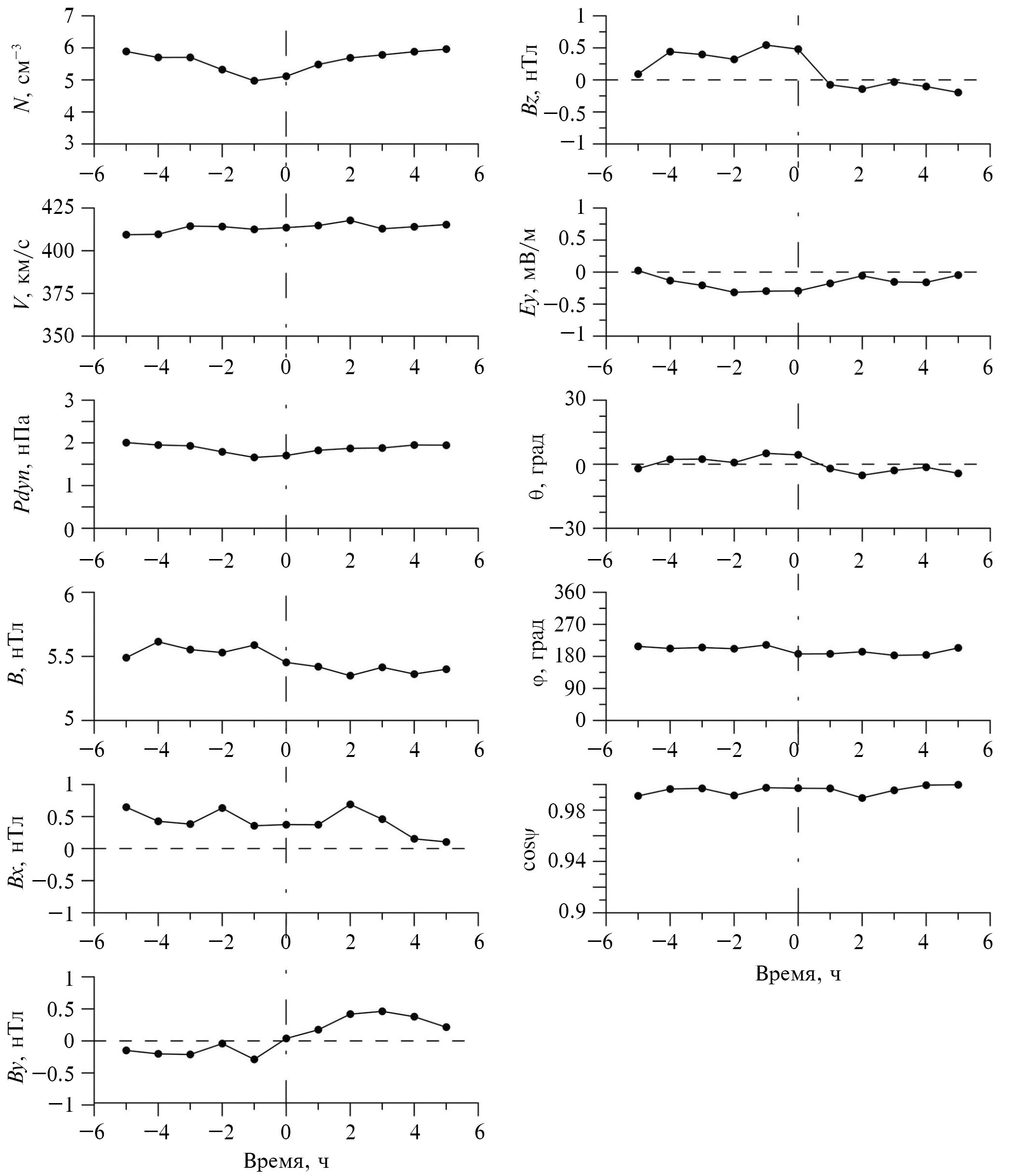 3.4. Далее перейдем к анализу условий в солнечном ветре и ММП, на фоне которых наблюдалась долговременная вариация понижения и последующего возрастания центральной несущей частоты SE. Чтобы выделить общие закономерности межпланетной среды, использовался метод наложения эпох. Рассматривались следующие параметры плазмы солнечного ветра и ММП: концентрация N, скорость V, динамическое давление солнечного ветра Pdyn = rV2 (r ‒ плотность плазмы), модуль напряженности B, Bx-, By-, Bz- компоненты ММП, Ey-компонента электрического поля солнечного ветра, широта ММП q (угол между вектором B и его проекцией на плоскость эклиптики), долгота ММП j (угол между проекцией вектора B на плоскость эклиптики и Bx-компонентой ММП), cosy (y – угол между скоростью солнечного ветра и вектором ММП), β − параметр, равный отношению теплового давления к магнитному (β = NkT/(B2/8π), где N и T ‒ плотность (см-3) и температура (K) плазмы протонов солнечного ветра, B ‒ величина межпланетного магнитного поля в нТл), соотношение плотности α-частиц к плотности протонов Na/Np. Все параметры анализировались в солнечно-эклиптической системе координат.