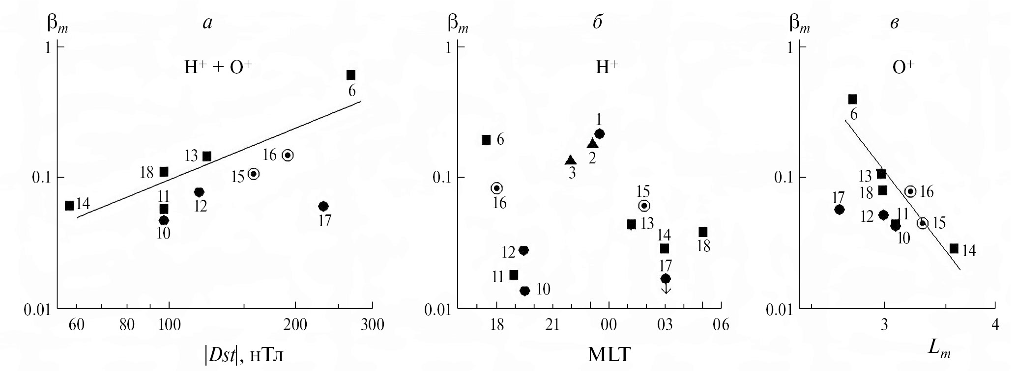 Отметим, что в отличие от точек, представленных квадратами, точки 15 и 16 не включают низкоэнергичную компоненту КТ и, следовательно, величины параметра βm для этих точек на рис. 2а занижены. Занижена также величина βm для точки 11 (ионы H+ интегрируются в интервале 10–570 кэВ, а ионы O+ – в интервале 10–60 кэВ). С учетом этих обстоятельств, можно получить более сильную зависимость параметра βm от |Dst|.