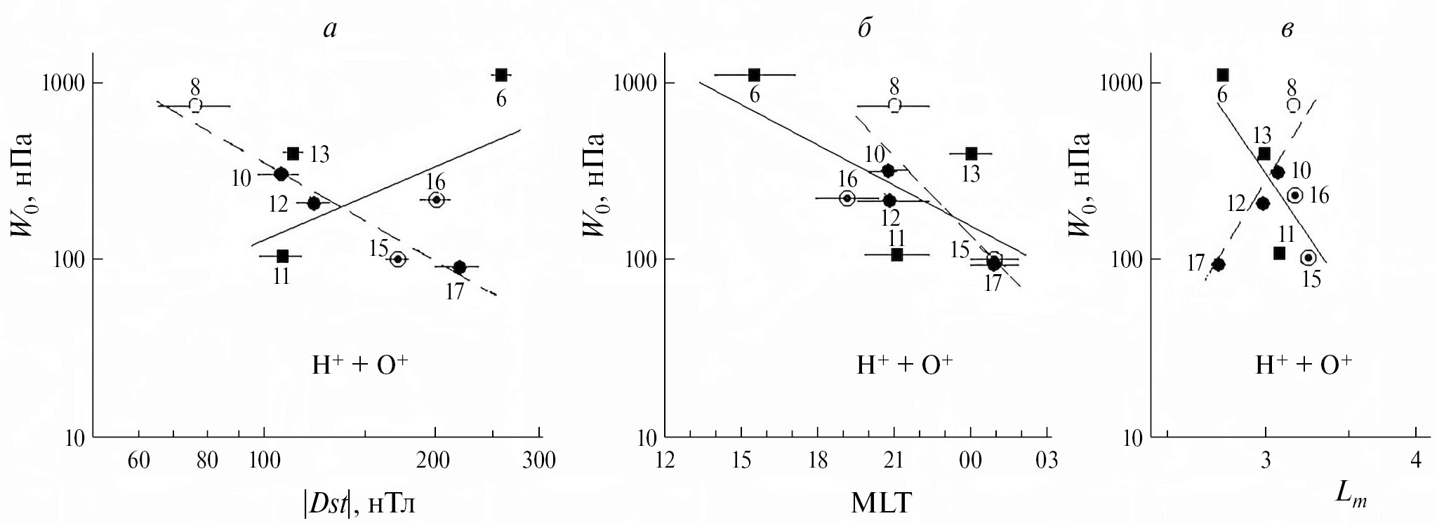 Детальный анализ распределений, представленных на рис. 4–6, требует также учета и других физических процессов, действующих на главной фазе бурь, таких как суббуревая активность магнитосферы. Суббури развиваются в околополуночном секторе магнитосферы, и на ионы O+ они оказывают гораздо большее влияние, чем на протоны. Суббури являются одной из основных причин разброса точек на рис. 4–6 и отклонений этих точек от общих закономерностей.