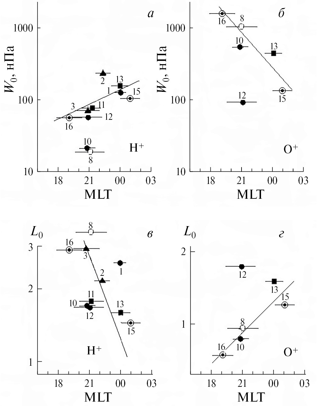 Согласно нашим расчетам, при увеличении MLT от 18 до 24 ч отношение ⟨wO+⟩/⟨wH+⟩ увеличивается от 0.21 до 1.64 (в 7.8 раз) на L = 4, от 0.05 до 1.57 (в 31.4 раз) на L = 5 и от 0.01 до 1.52 (в 152 раза) на L = 6. При 18 MLT доминируют ионы H+ (особенно сильно – на больших L), а при 24 MLT – ионы O+.