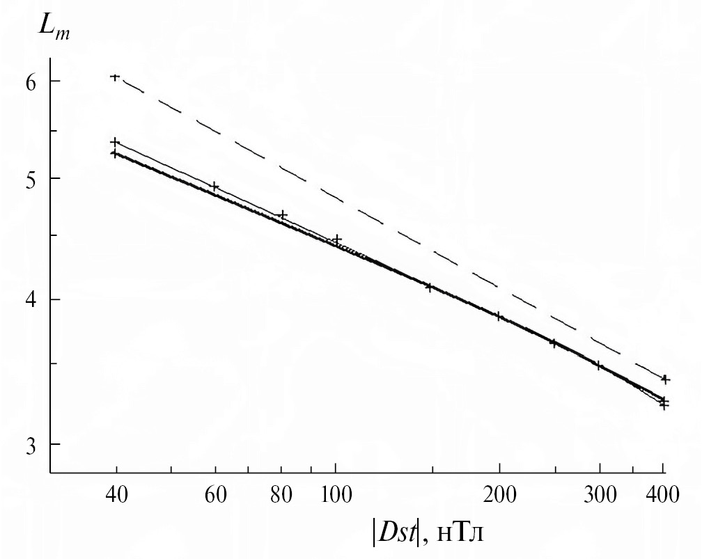 Кроме того, для точек 15 и 16 на рис. 1 величины параметра Lm могут быть несколько завышены: эти точки относятся к более узкому диапазону энергии (50–200 кэВ). С учетом этого обстоятельства, экспериментальная зависимость Lm(|Dst|) для ионов с E ~ 1–300 кэВ на рис. 1 становится круче, наклон ее приближается к наклону кривой для низкоэнергичной компоненты КТ и к наклону расчетных кривых на рис. 1а.