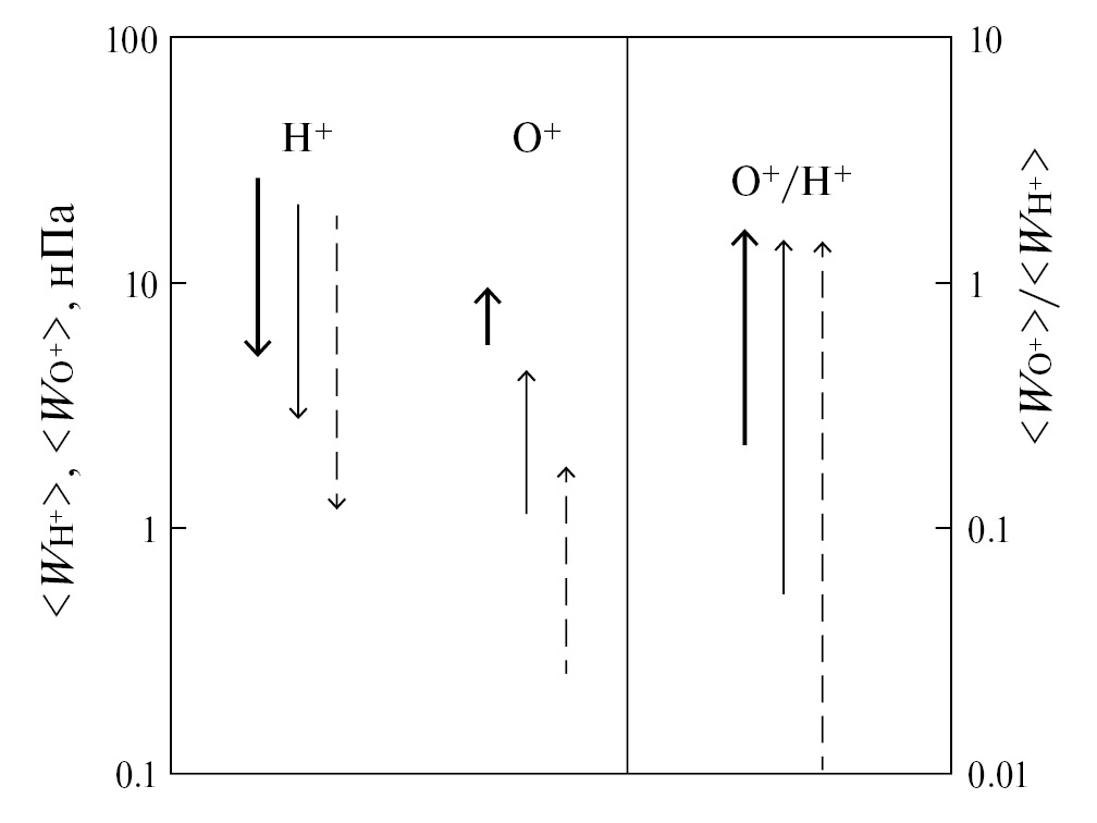 Для наглядности, результаты этих расчетов представлены на рис. 8 в виде векторов. Начало каждого вектора соответствует 18 MLT, а его конец (стрелка) – 24 MLT. Левая шкала соответствует величинам ⟨wH+⟩ и ⟨wO+⟩, а правая – величинам отношения ⟨wO+⟩/⟨wH+⟩. Толстые, тонкие и пунктирные векторы отвечают L = 4, 5 и 6 соответственно.