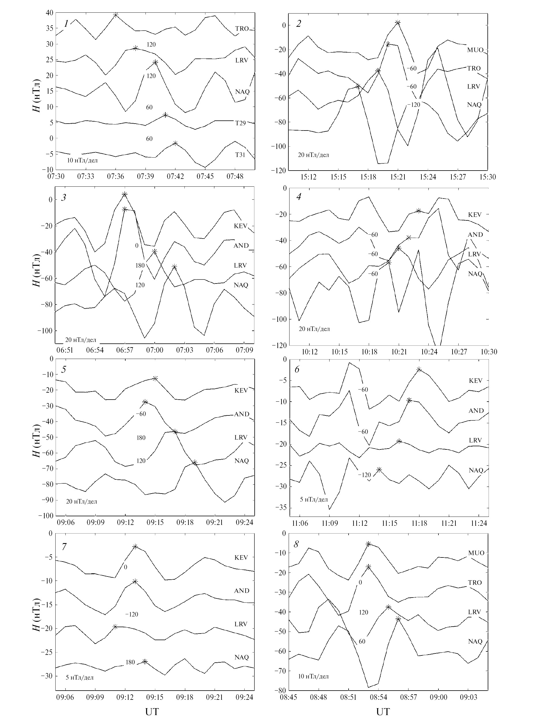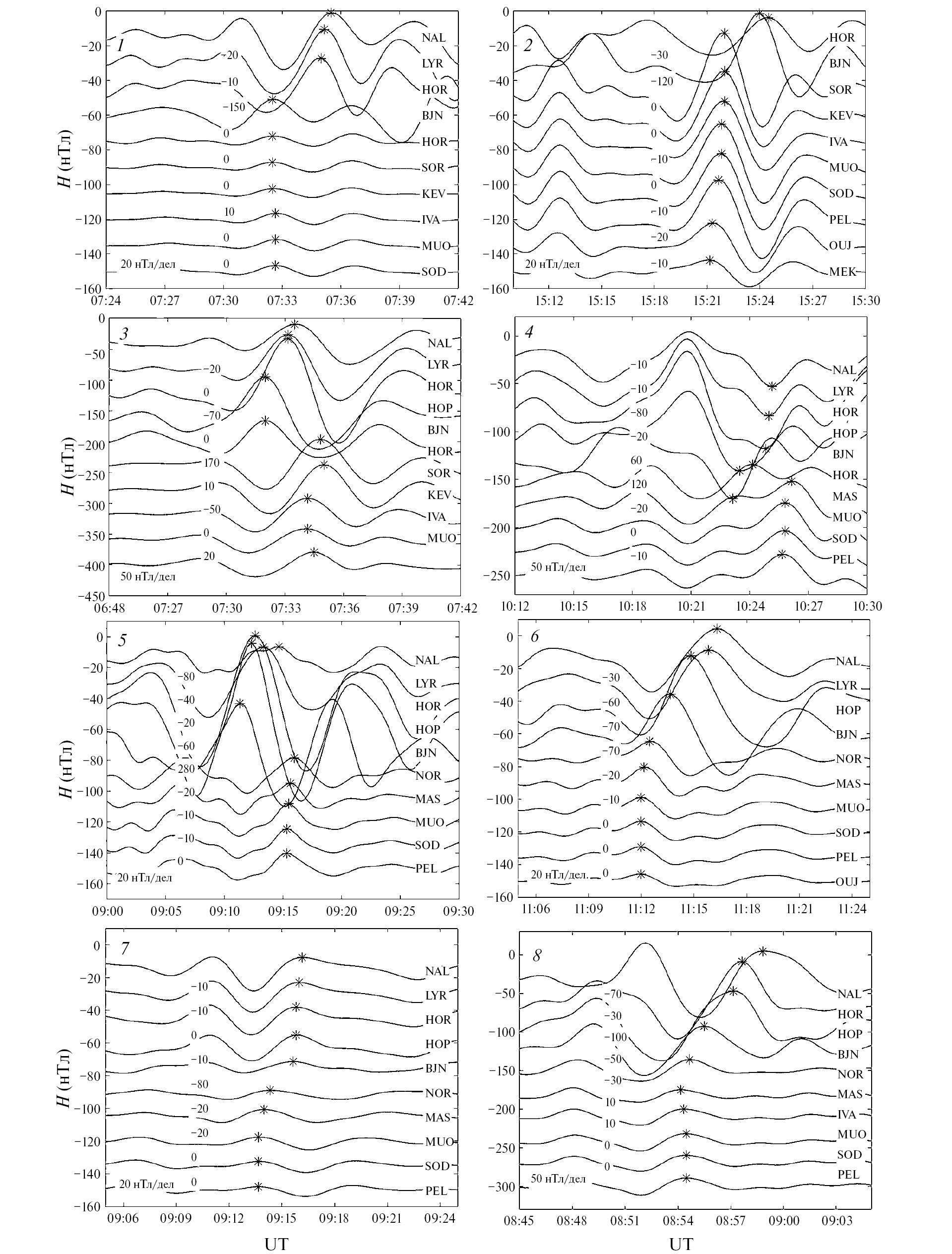 На рис. 2 представлены азимутальные профили H-компоненты поля на магнитных широтах 65‒66° в рассматриваемых событиях. На нем станции расставлены по степени уменьшения геомагнитной долготы с востока на запад (в верхней части рисунка приведена станция с наибольшей долготой), номер события из табл. 3 показан на каждом профиле. Подобно рис. 1, выбранные максимумы обозначены звездочками, рядом с которыми приведены значения фазовых задержек в секундах. Как видно из рис. 2, распространение в событиях происходит в основном на запад (события 1, 3, 5, 7, 8), но в ряде событий распространение происходит на восток (события 2, 4, 6). В событии 2 распространение происходит в восточном направлении, что согласуется с временем начала этого события 15:15 UT (в этот момент времени станции наблюдения находились в послеполуденном секторе). Заметим, что рис. 1 и рис. 2 приведены для наглядного объяснения характера распространения пульсаций. Для анализа фазовых задержек выбирались максимумы (минимумы) явно выраженные на всех станциях.