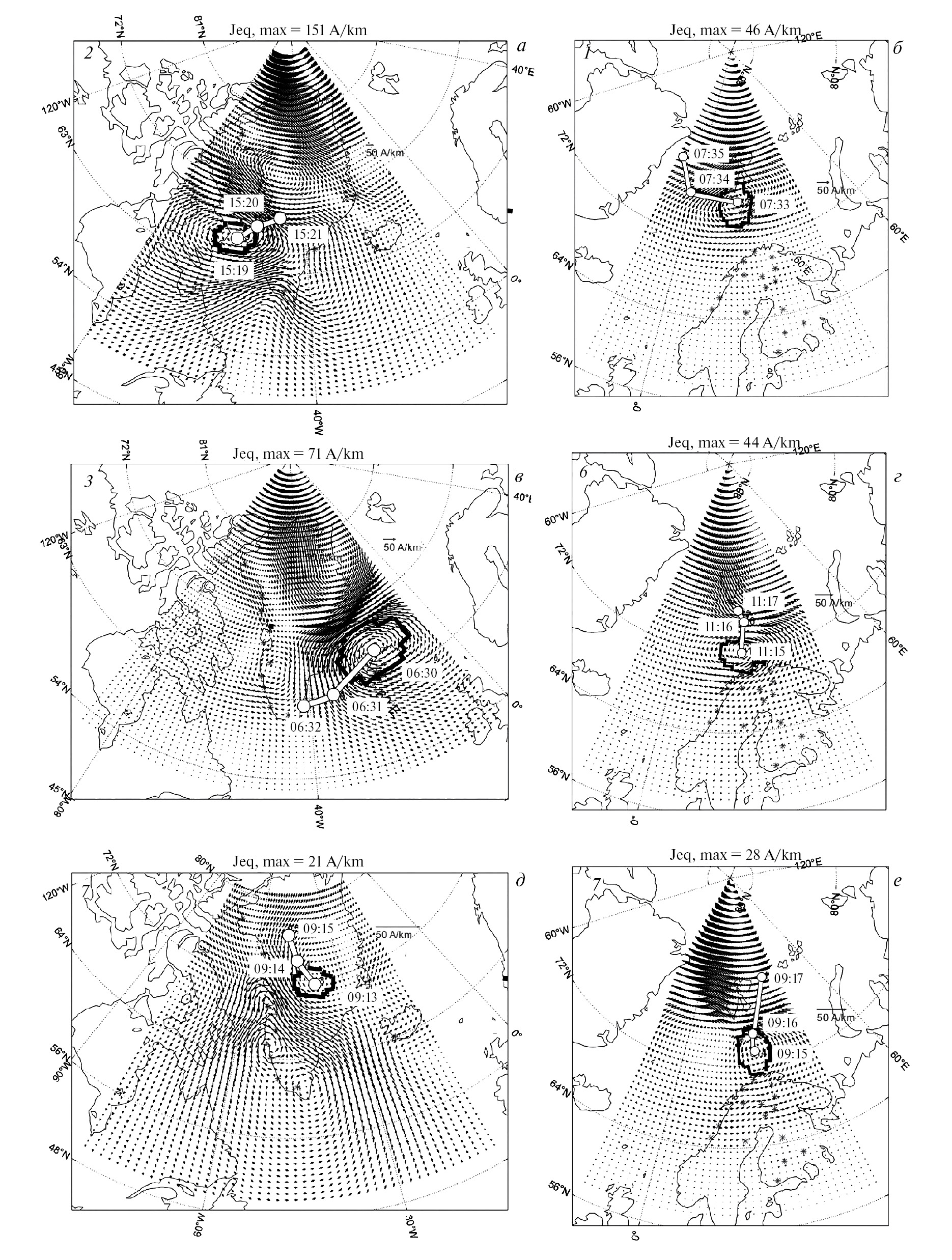 На рис. 3 показаны распределения эквивалентных ионосферных токов вдоль меридиональных сетей GREENLAND COAST CHAIN и IMAGE, черной сплошной линией схематично показан контур вихря в начальный момент времени. Из рис. 3 видно, что вихри перемещались в разных направлениях: в северо-западном (а), в северо-восточном (б, д), в юго-восточном (в), на север (г, е). Величина смещения вихря составляла до 6° по широте и до 10° по долготе. Следует отметить, что на широтах выше 68° сети IMAGE, где расположение станций близко к меридиональной цепочке (от BJN до NAL) неопределенность траектории вихря выше по сравнению с другими участками цепочки вследствие отсутствия двумерного покрытия при определении проекции ротора.
