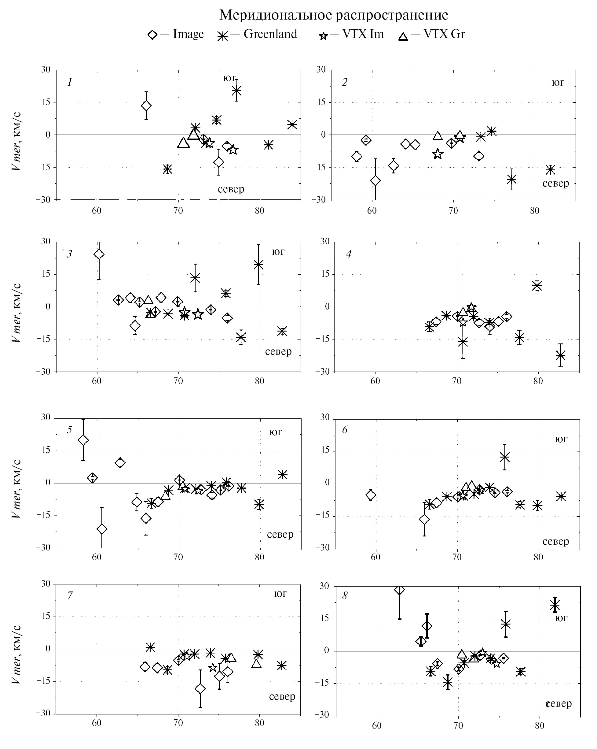 На рис. 4 приведено распределение меридиональных скоростей распространения Pc5 пульсаций относительно геомагнитной широты. Здесь положительные значения скоростей соответствуют распространению к югу, отрицательные – к северу. На рис. 4 звездами и треугольниками показаны скорости перемещения центров вихрей, ошибки измерений, – вертикальными линиями. На рис. 4 также приведены ошибки измерений. Абсолютные погрешности единичных косвенных измерений были рассчитаны на основе инструментальных погрешностей измерений используемых физических параметров с уровнем достоверности 95%. Из рис. 4 видно, что наряду с северным также наблюдалось и южное распространение. Однако, во всех событиях за исключением события 3 преобладало северное распространение. Отмечалось увеличение скорости распространения к северу по направлению к более низким широтам начиная с широты 70°, скорость возрастала от нескольких км/с до 10‒15 км/с. На широтах выше 75° очевидно увеличение скорости до 10‒15 км/с. Во всех событиях, за исключением события 7, значения скоростей, измеренные на обеих цепочках, удовлетворительно согласуются.