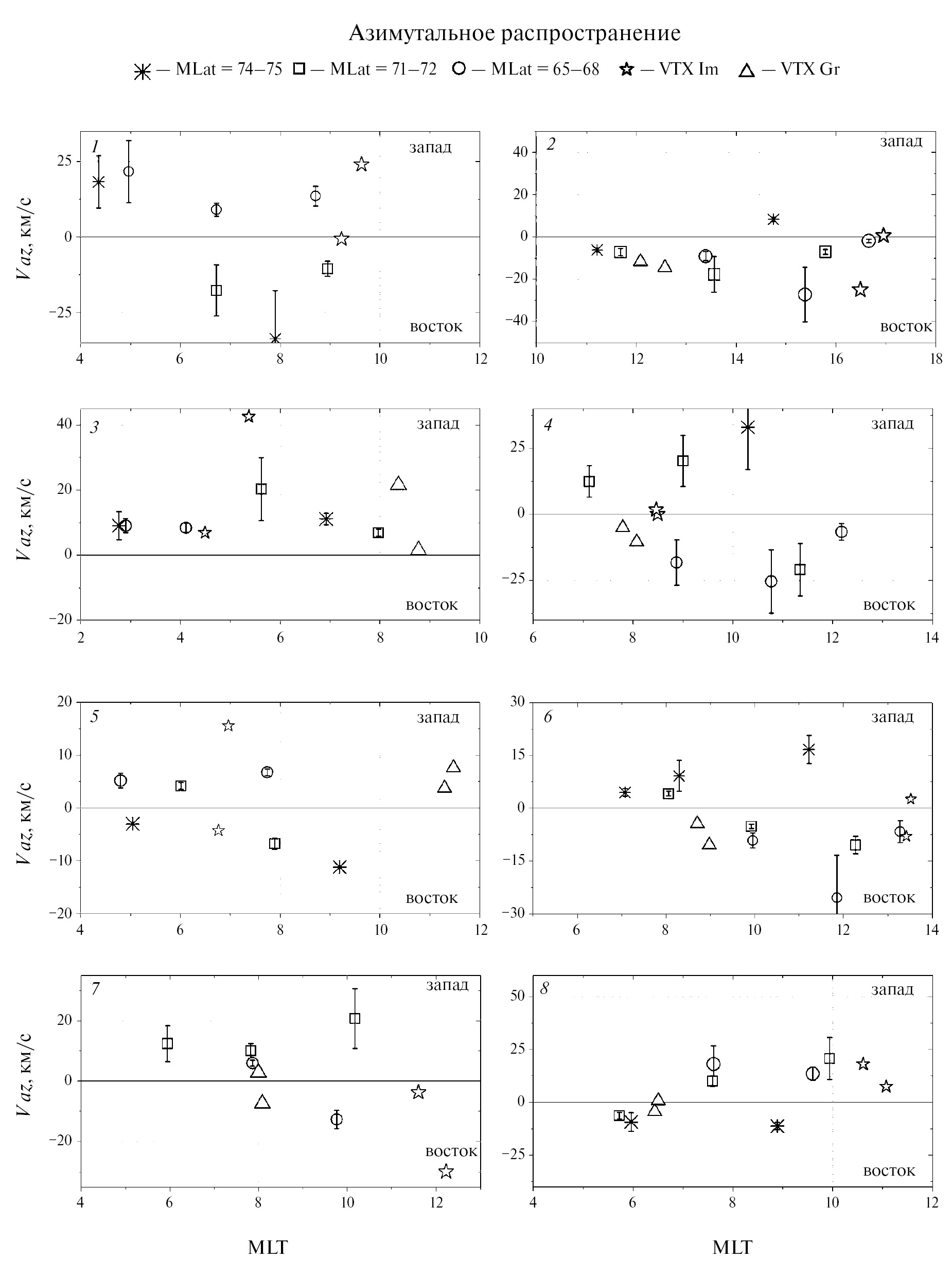 На рис. 5 показано распределение азимутальных скоростей распространения геомагнитных пульсаций и центров эквивалентных токовых вихрей по времени MLT (геомагнитной долготе) во всех событиях. Распространение пульсаций изучалось вдоль 3-х диапазонов широт: 74‒75°, 71‒72°, 65‒68°. При этом распространение вихрей рассматривалось относительно станций сетей IMAGE, GREENLAND COAST CHAIN. Ошибки оценки азимутальных скоростей распространения рассчитаны таким же образом, как и для меридиональных скоростей. Положительные значения скоростей соответствуют распространению на запад, отрицательные – на восток. Из рис. 5 видно, что кроме западного распространения наблюдалось также и восточное распространение пульсаций. Отмечалось уменьшение скорости распространения по направлению к ранним часам MLT, что можно интерпретировать как затухание волны при удалении от сектора первоначального контакта неоднородности солнечного ветра с магнитосферой.
