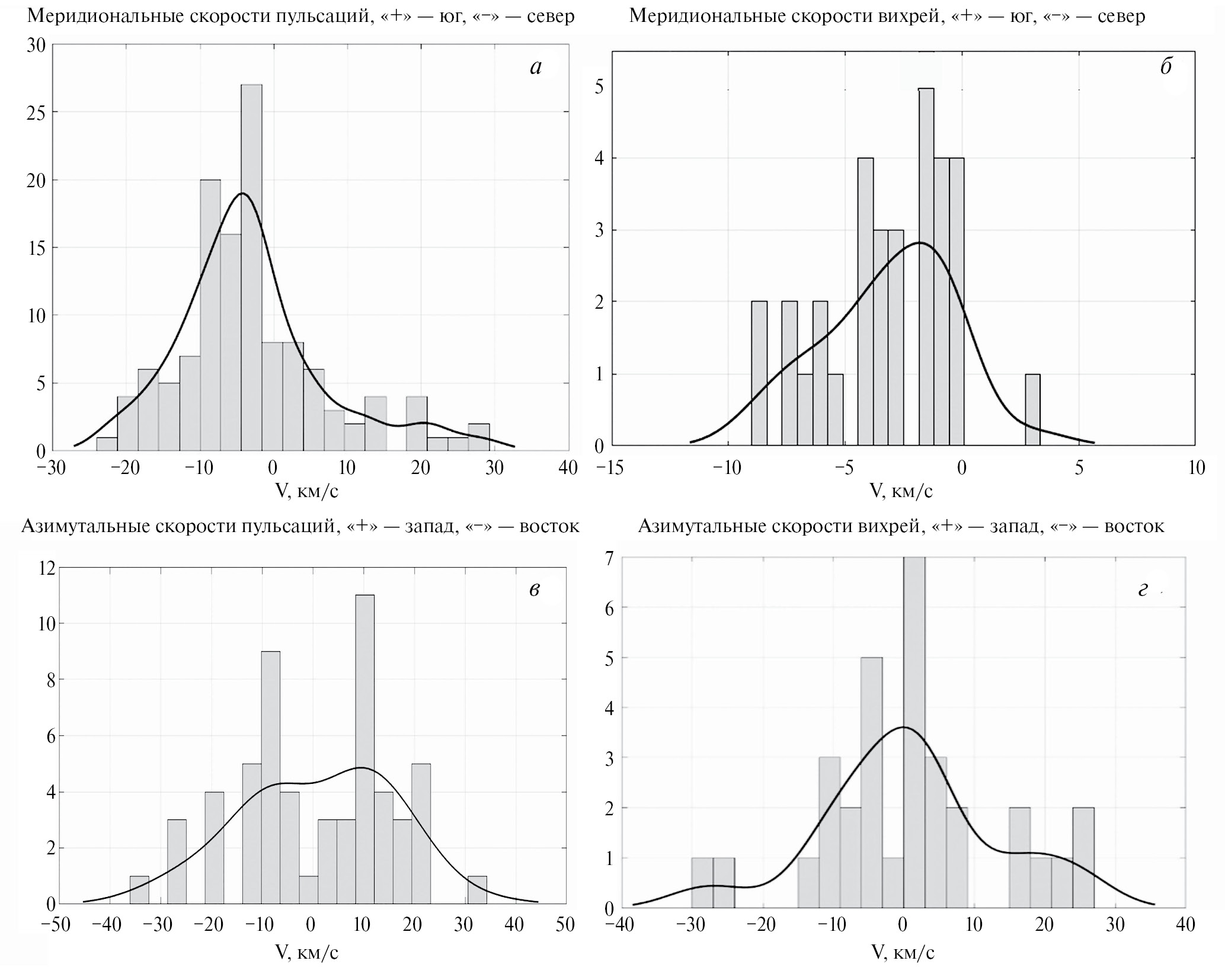 Количественные характеристики скоростей распространения Pc5 пульсаций и вихрей на рис. 4 и рис. 5 приведены на рис. 6 как гистограммы распределения значений скоростей распространения геомагнитных пульсаций и эквивалентных токовых вихрей. На рис. 6а, б показаны гистограммы распределения меридиональных скоростей, на рисунке 6в, г – азимутальных. По оси ординат рис. 6а, в отложено число измерений скоростей Pc5 пульсаций по обеим сетям станций и по всем диапазонам широт, по оси ординат рис. 6б, г отложено число измерений скоростей распространения вихрей по обеим сетям станций. На гистограммах показана сглаживающая линия ‒ результат непараметрического способа оценки плотности случайной величины (Kernel Density Estimation). Из гистограмм видно, что распространение пульсаций и вихрей имеет сходный характер: по меридиану пульсации и вихри преимущественно распространяются к северу. В большинстве случаев скорость распространения пульсаций была примерно 5 км/с, а вихрей – 2 км/с, при этом по азимуту пульсации и вихри распространяются к западу, а скорость распространения пульсаций составляет около 10 км/с, а вихрей 3 км/с. Однако в распределении азимутальных скоростей как пульсаций, так и вихрей есть сравнимые по величине максимумы, соответствующие восточному распространению: скорость пульсаций составляет 10 км/с, вихрей ‒ 5 км/с.