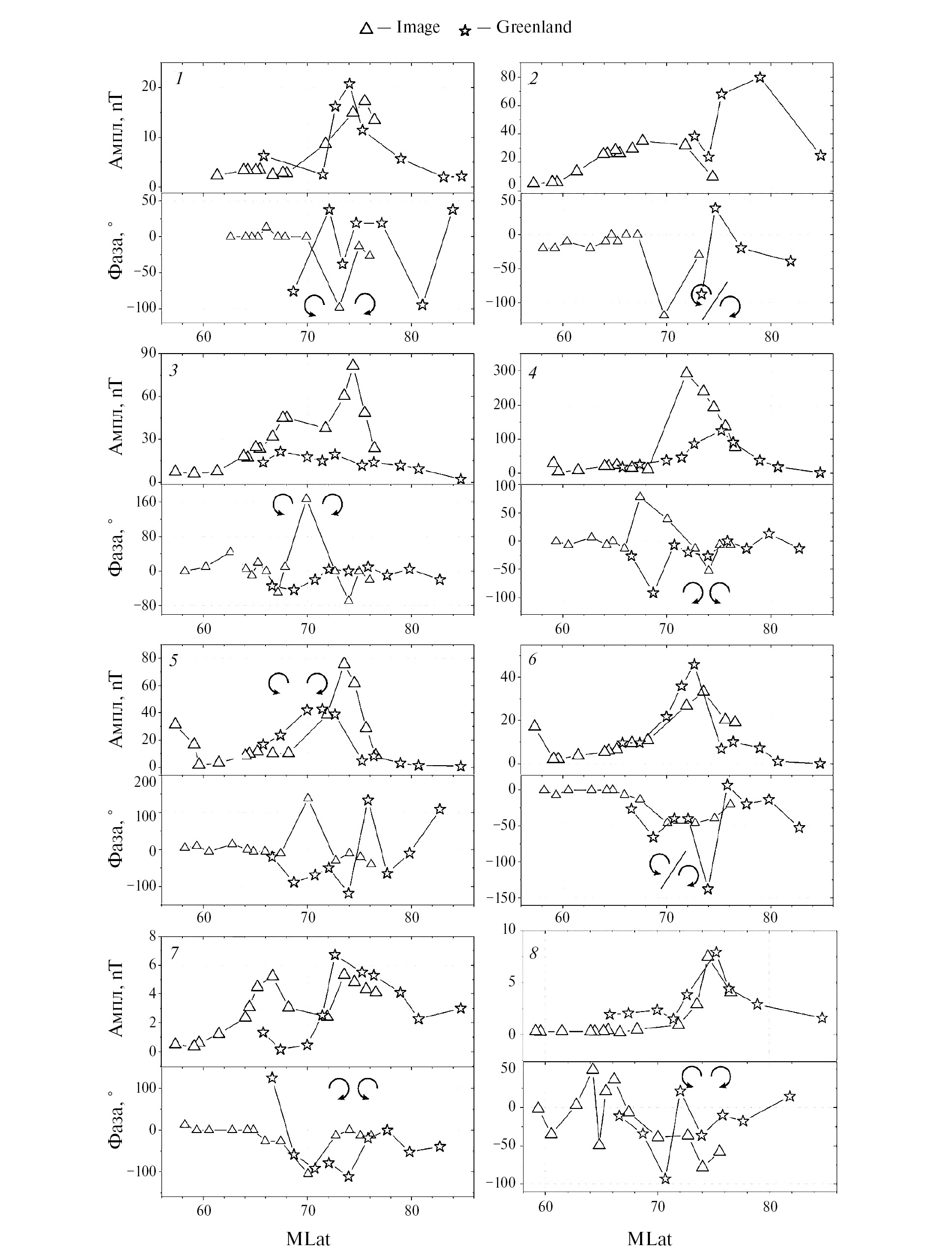 На рис. 7 показано распределение амплитуды и разности фаз по широте во всех событиях вдоль обоих меридиональных сетей станций. Из рис. 7 следует, что пульсации имели хорошо выраженные максимумы амплитуды на обеих цепочках, совпадающие по широте практически во всех событиях. Вблизи широты этих максимумов наблюдалось изменение фазы на величину, достигавшую 180° в событиях 3, 5 ,6. Считается, что широтный максимум амплитуды пульсаций, сопровождаемый сдвигом фазы на 180°, соответствует резонансу силовых линий [Glassmeier et al., 1999]. При этом широтные максимумы в рассматриваемых нами событиях наблюдались на широте 69‒74°. В событии 2 широты максимума амплитуды и изменения фазы отличаются на разных сетях станций, скорее всего вследствие малого количества станций Гренландской сети (всего 6 станций), которые были доступны для анализа широтного хода амплитуды и фазы в этом событии.